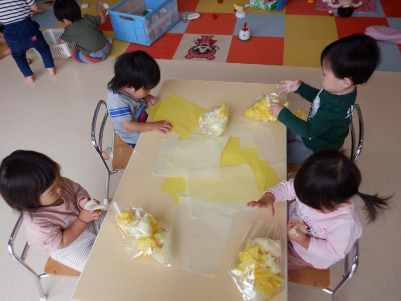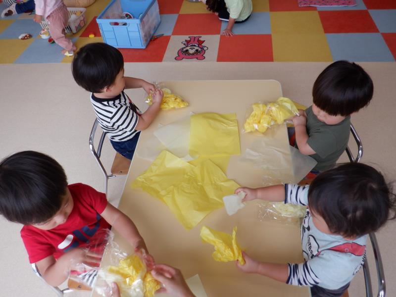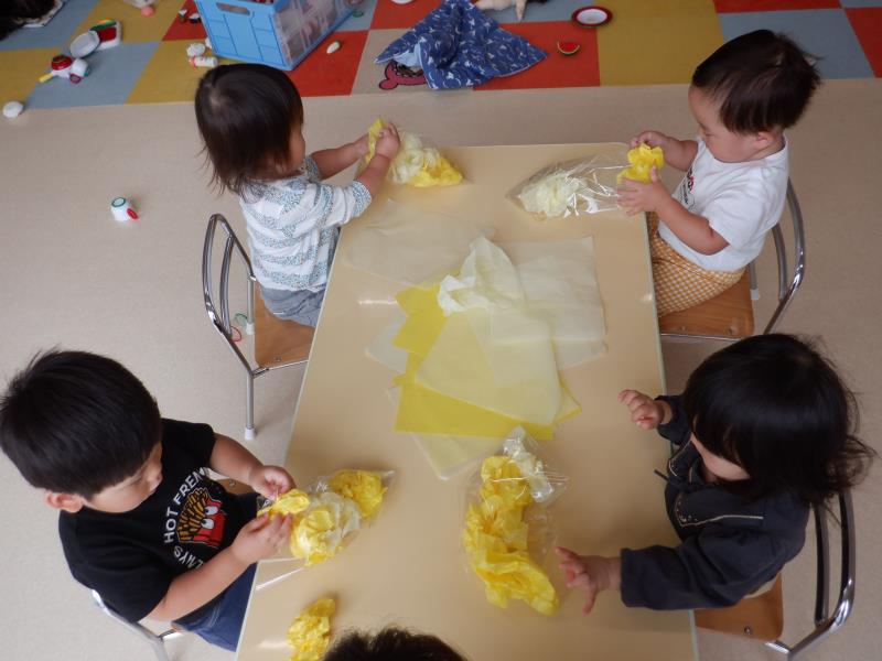 初めて製作でお花紙を丸めてみたちゅうりっぷさん。