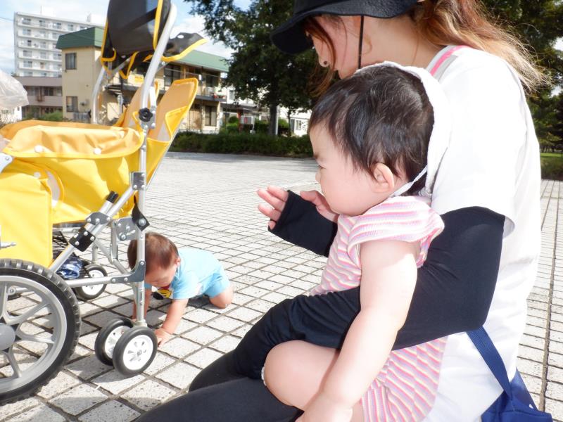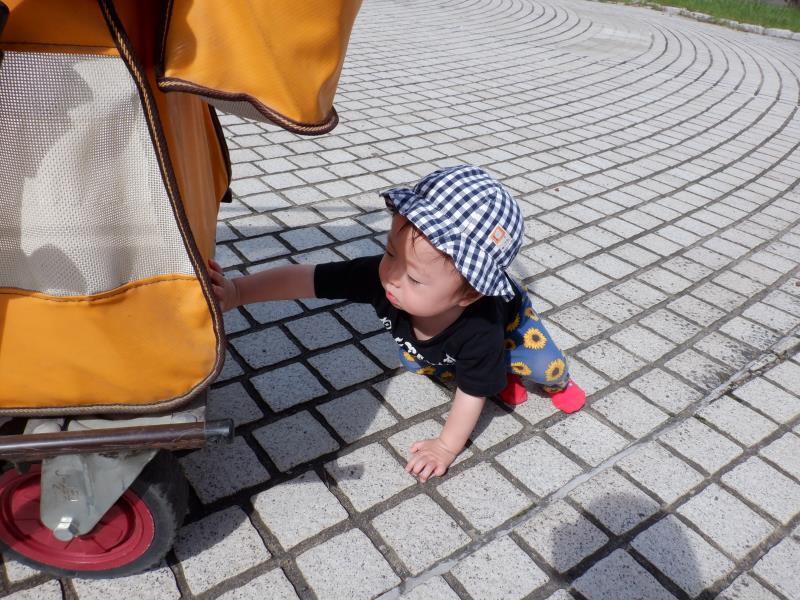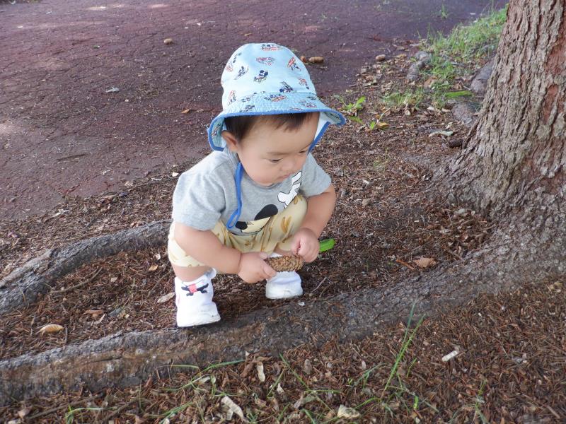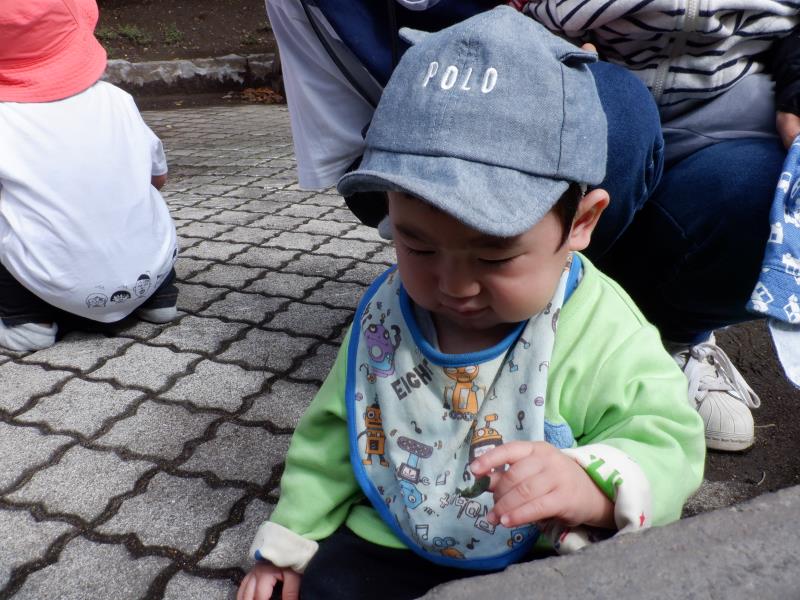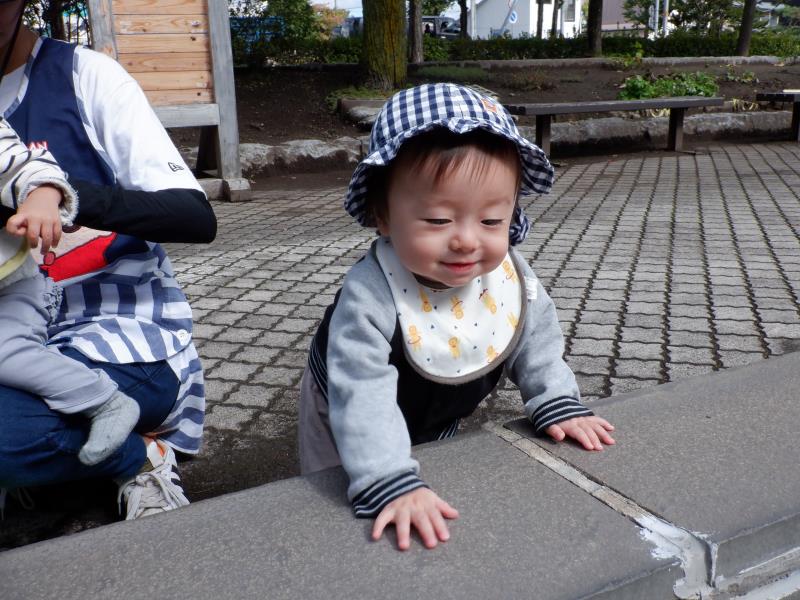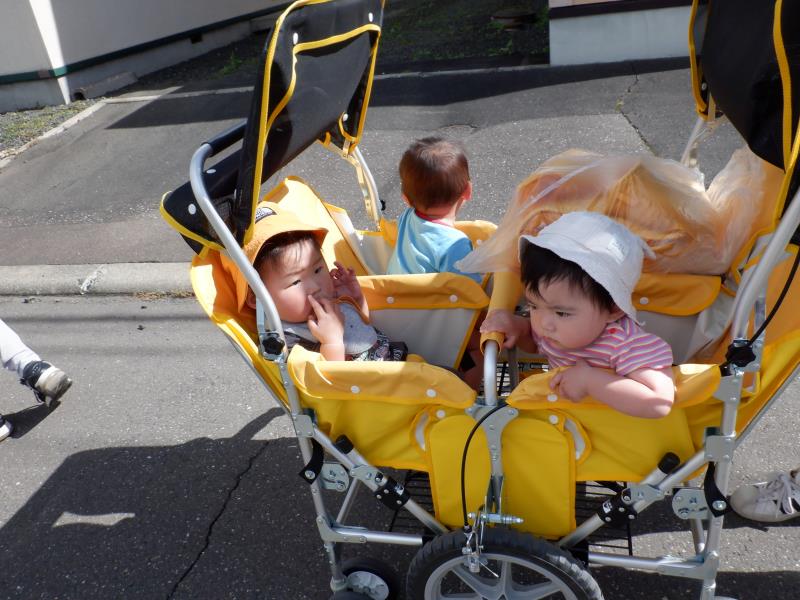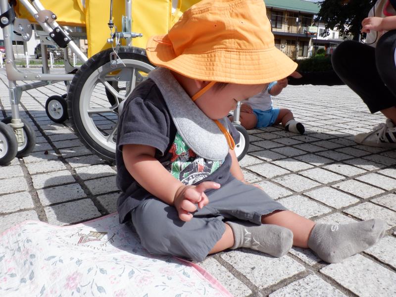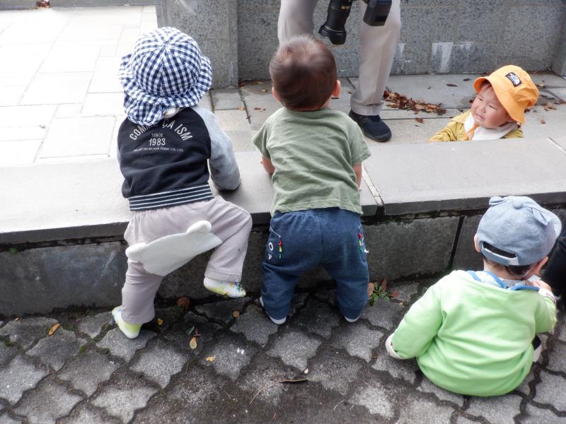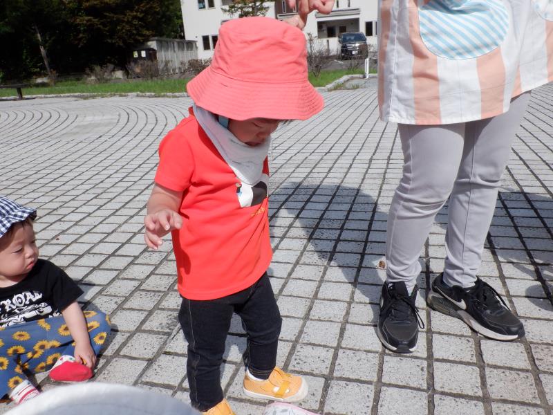ももさんは、遊歩道へ行ってきました。水路のふちにつかまり立ちをしてみたり、先生のお膝に座ってお友達の様子を眺めたりして過ごしましたよ。