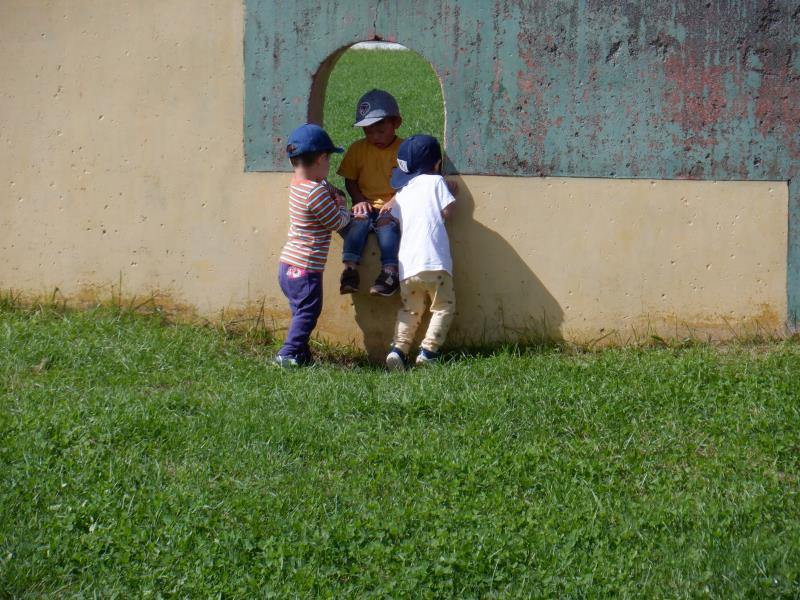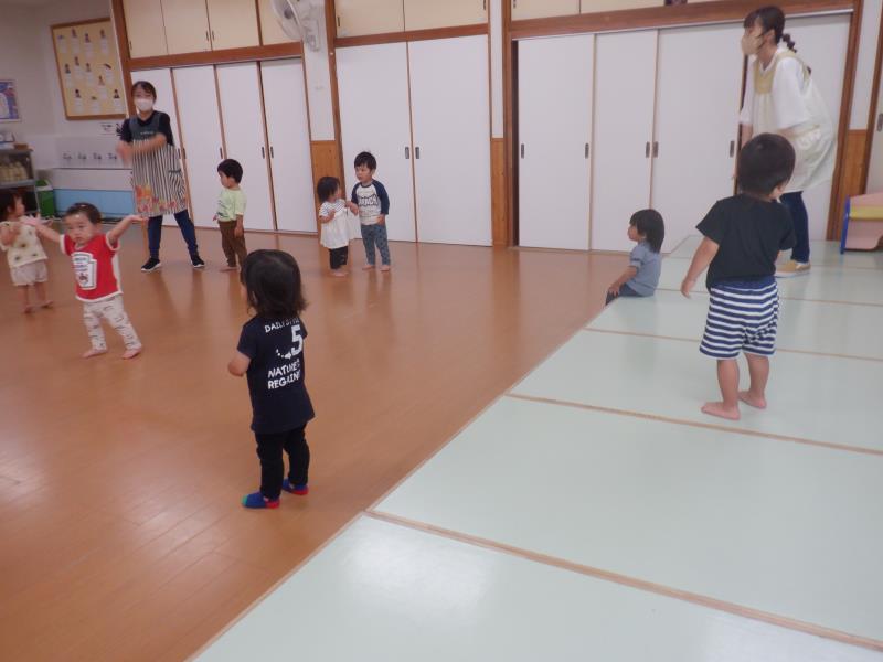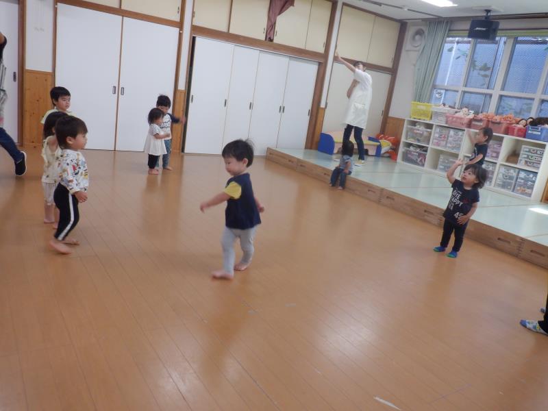 良いお天気の中遊具やボールで遊んだ後は、お遊戯室でちゅうりっぷさんが遊んでいたので仲間に入れてもらいました。