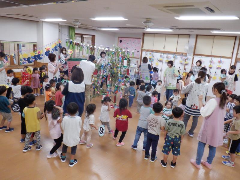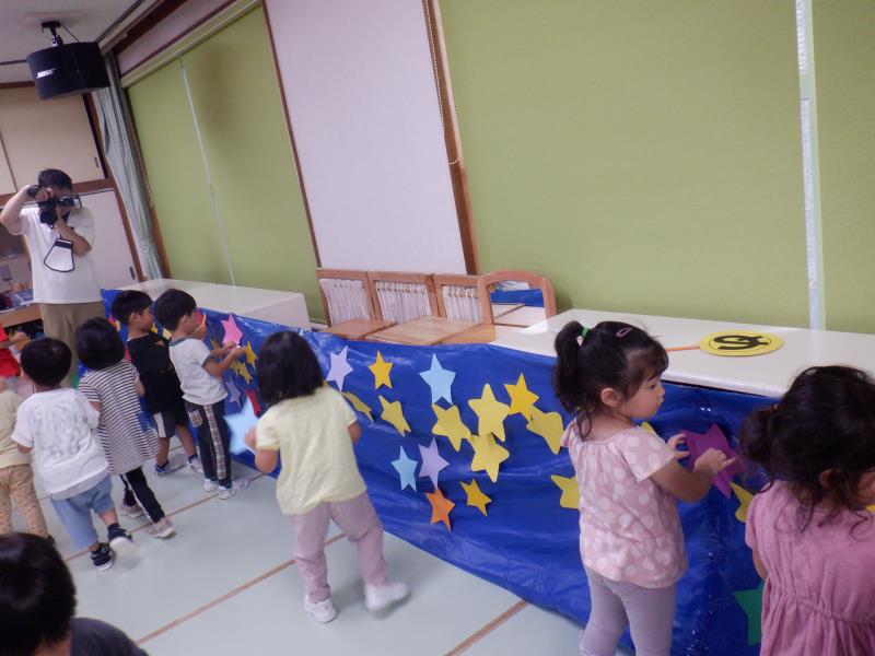盆踊りを踊って、大きな天の川に一人ずつお星さまをペタッとつけて、とってもきれいな天の川の完成!