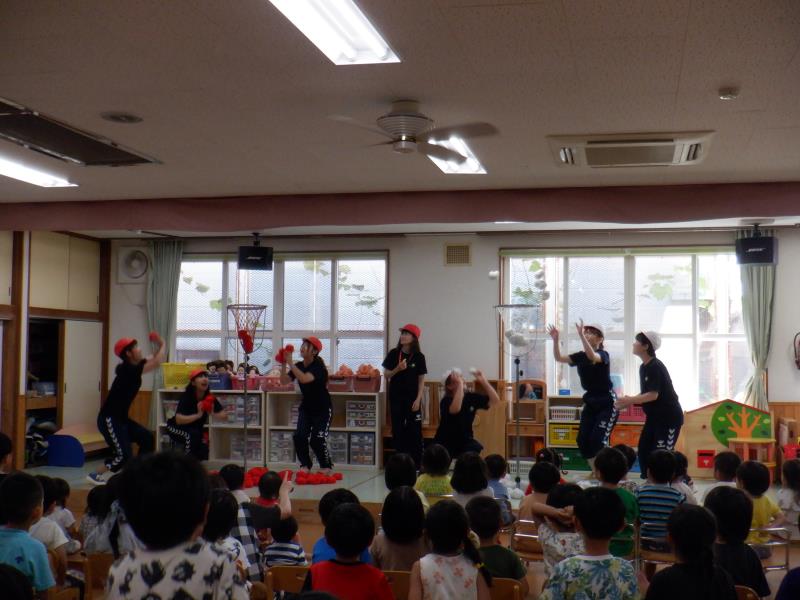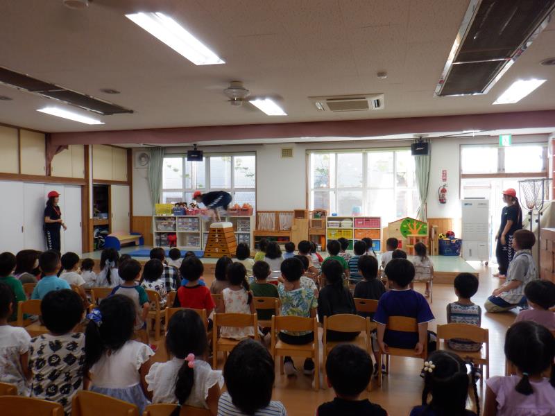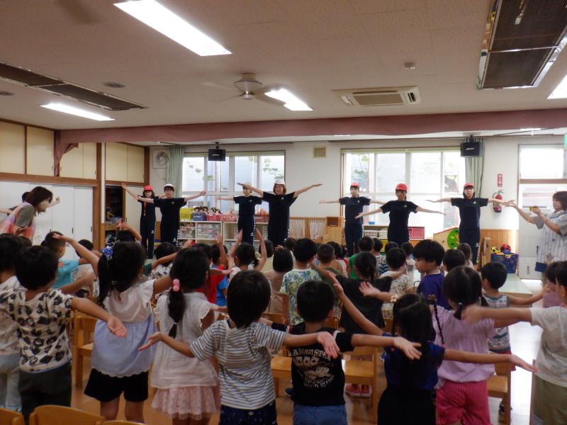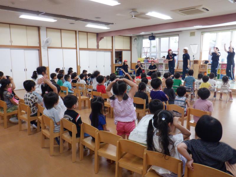 子どもたちも一緒にラジオ体操をしたり、先生が縄跳びや跳び箱を披露しました。