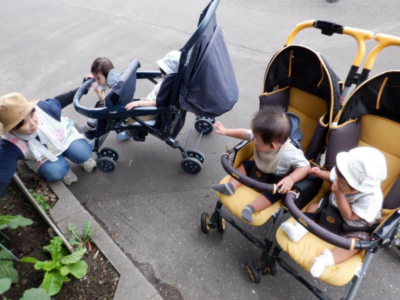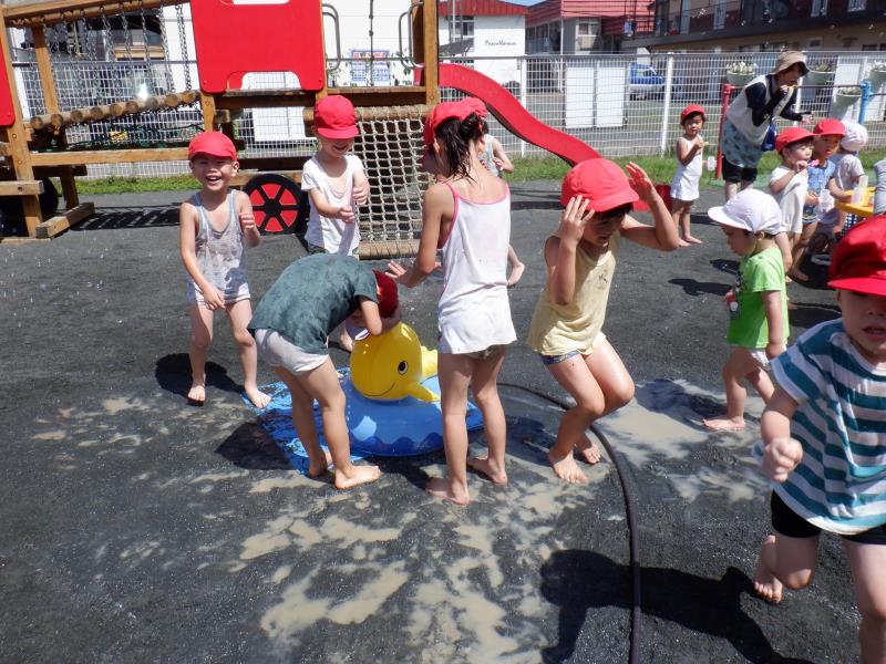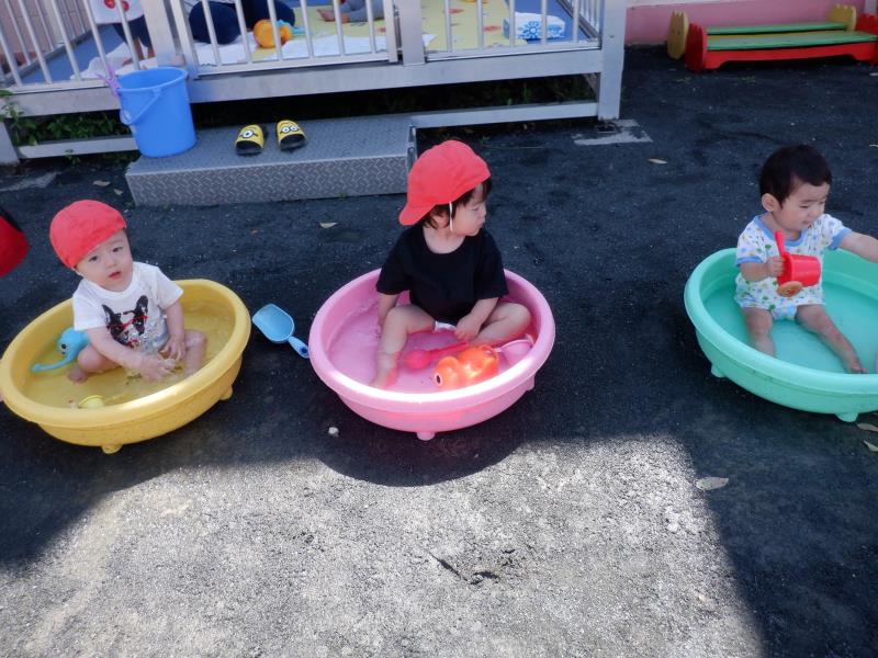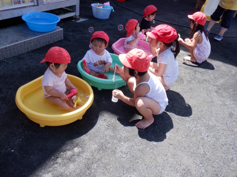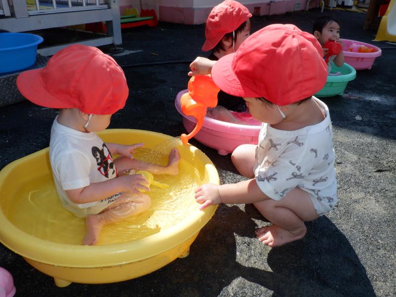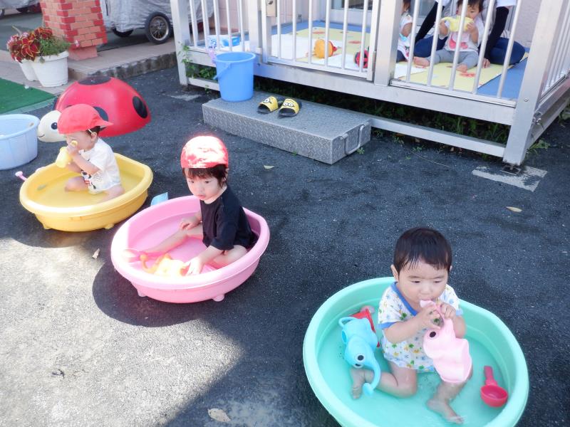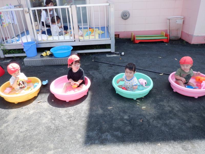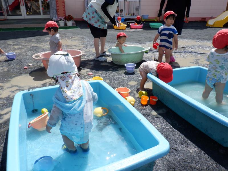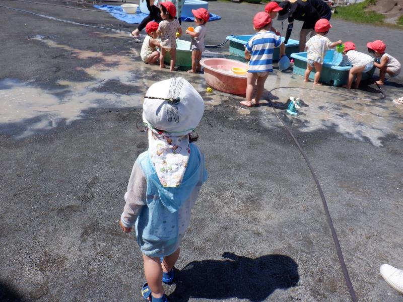 今日の子育て支援の園庭開放は、暑かったので水あそびをしましたよ!園のお友達の仲間に入れてもらって遊びました。