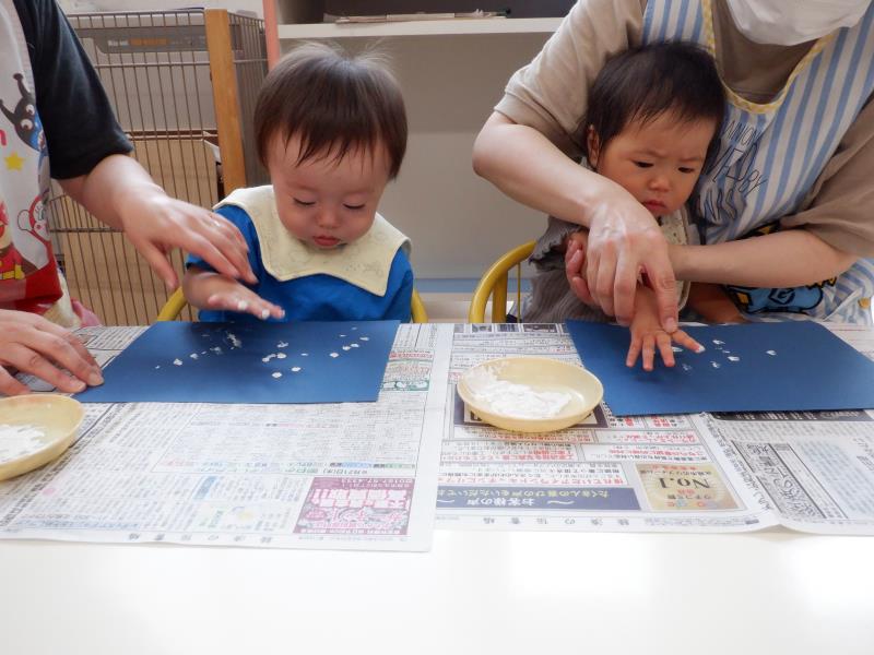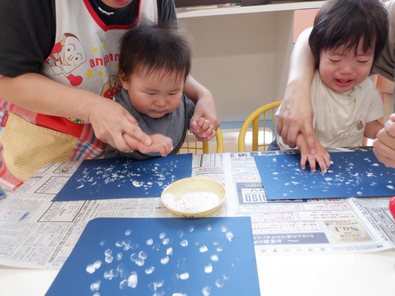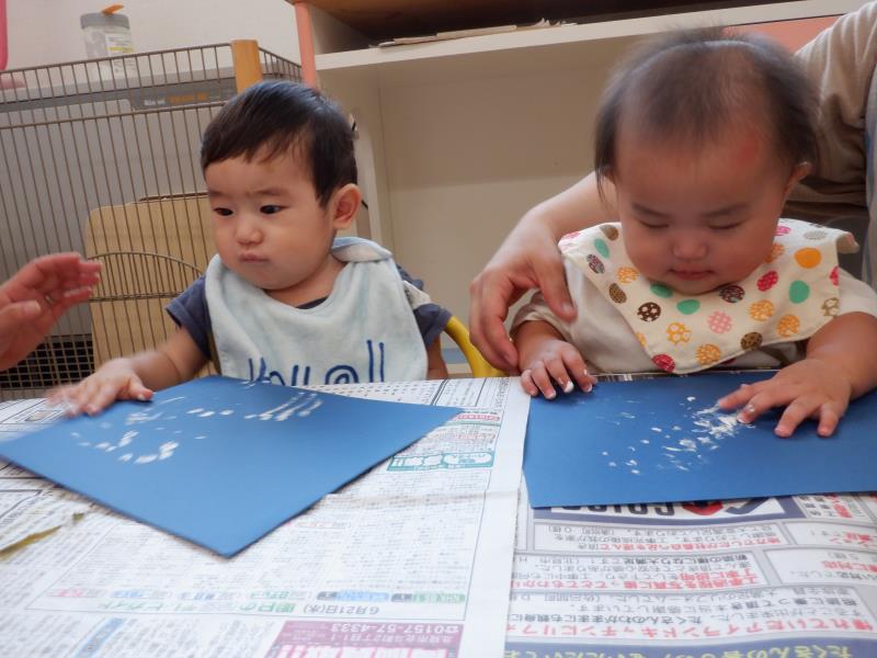 先生と一緒に画用紙につけたり、慣れてきたら自分で指を動かしてペタペタするお友達もいましたよ。