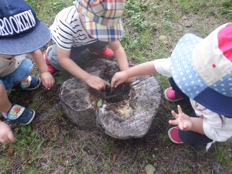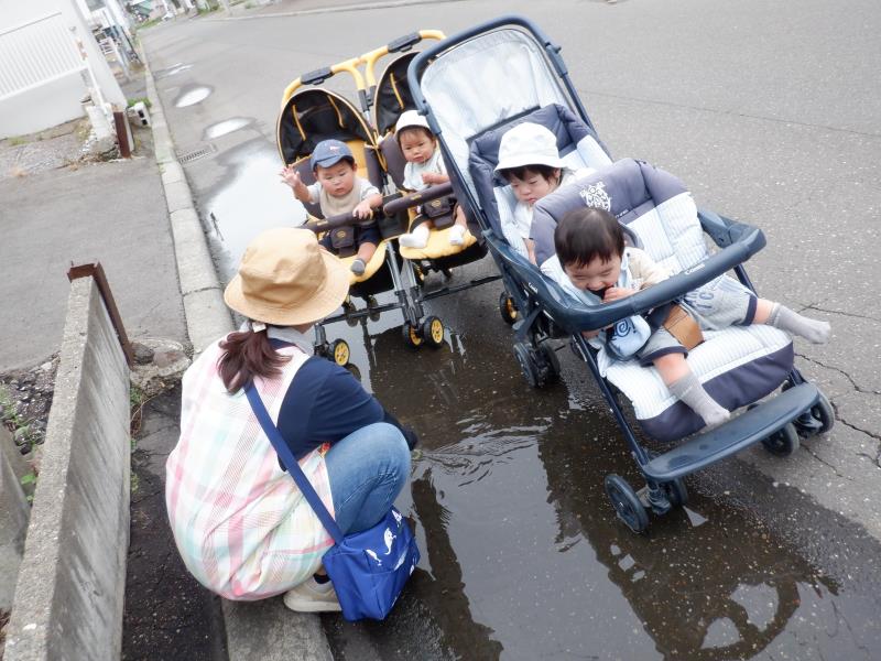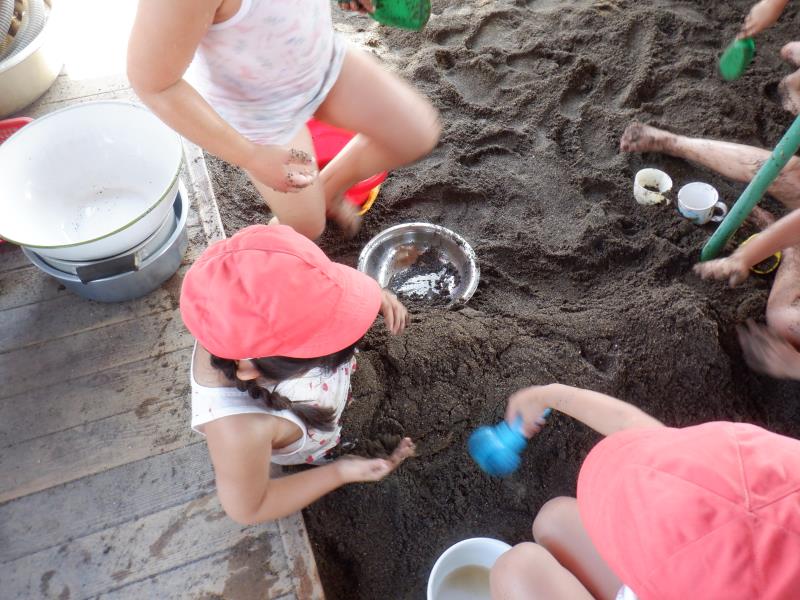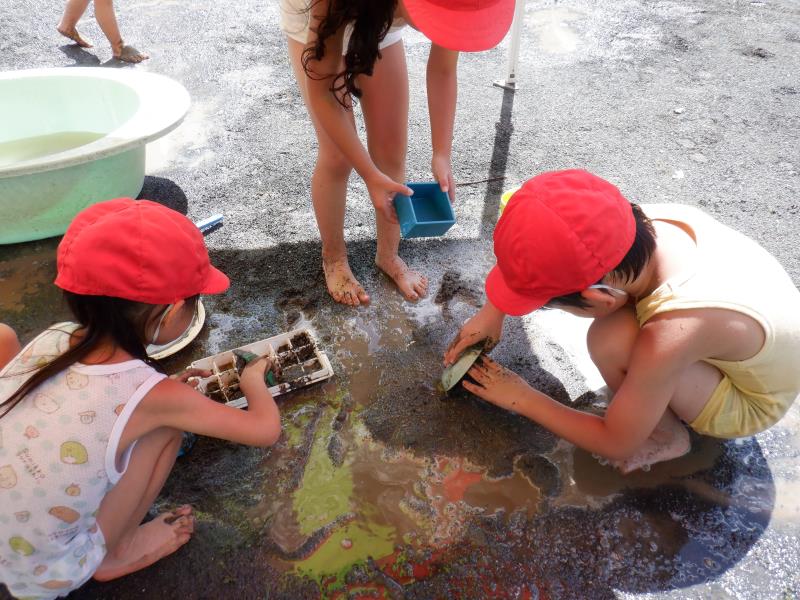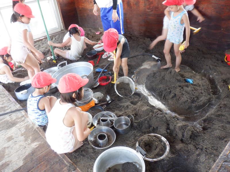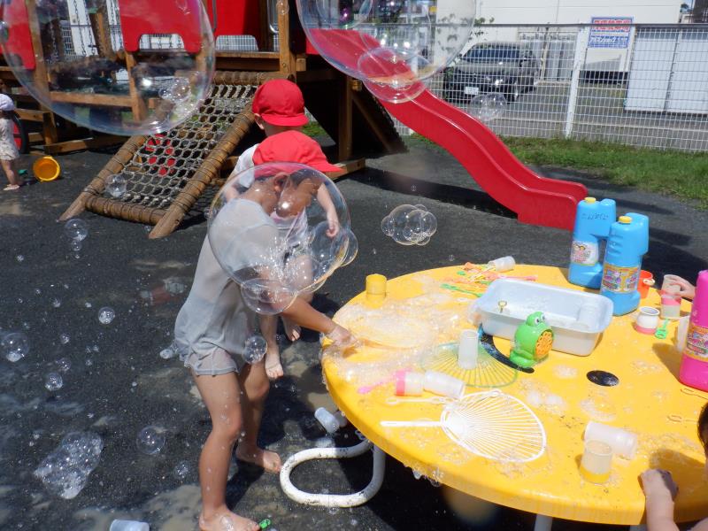 園庭にはシャボン玉、クジラシャワーも出ていて、お山から水を流してみたり、泥水遊びをしたりと好きな遊びを楽しみます。