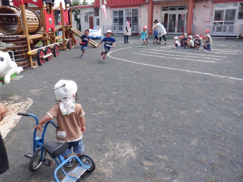 お砂場ランドで遊んだり、園庭ですみれさんのリレーを見学。