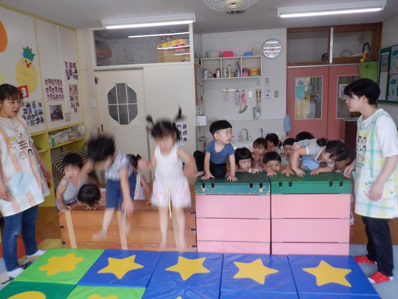 ジャンピングマットについているマークを見て、あそこまで跳んでみよう!と目標を持ってジャンプしたり、お友達と一緒に跳んでみよう!と仲良くジャンプしたり♬