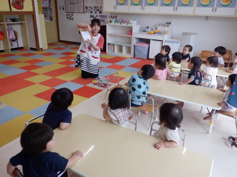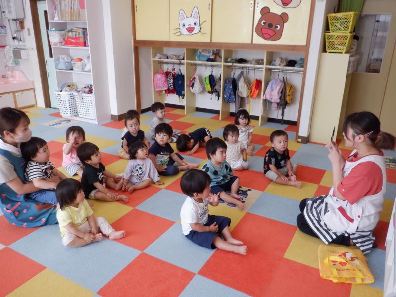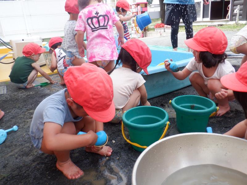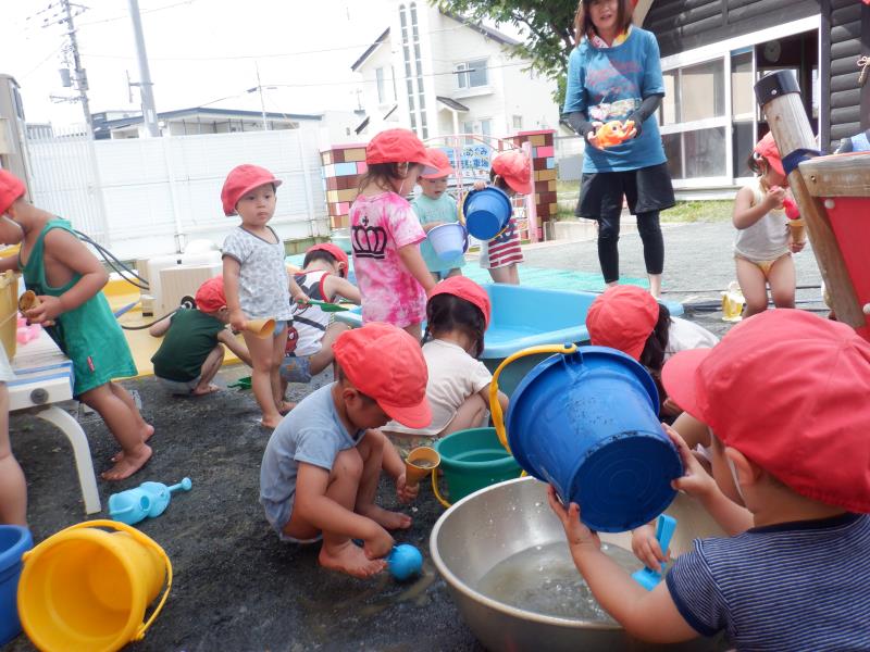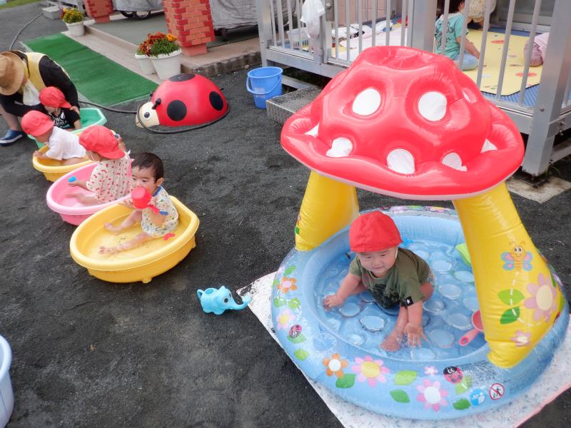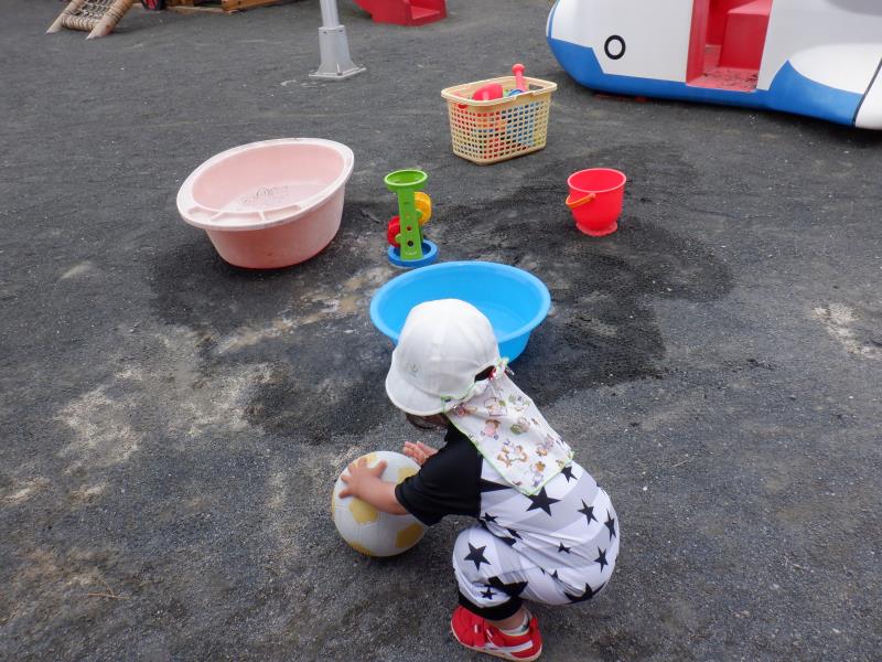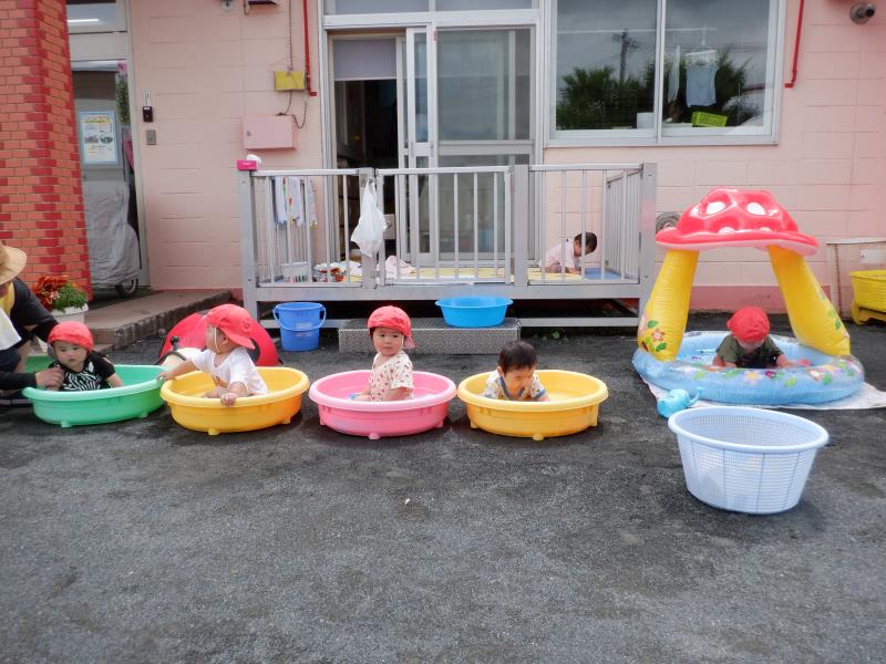 気温が高かったので、園庭で水遊びをしましたよ!