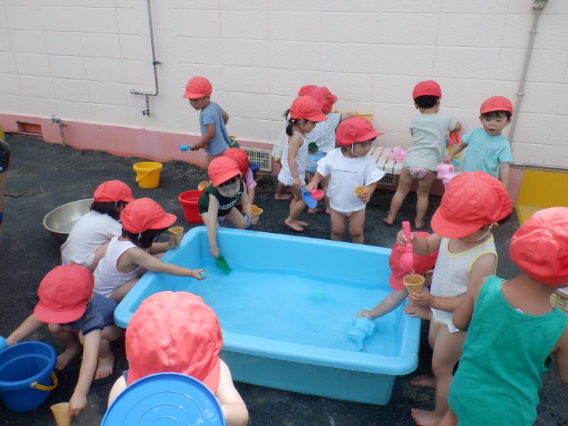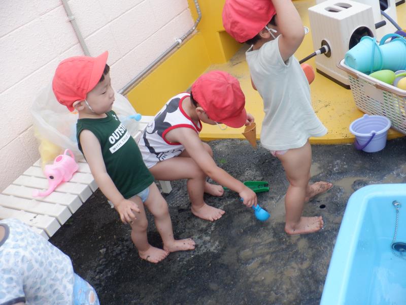 水遊びをしたたんぽぽさん。次第に泥んこ遊びを楽しむ姿もみられ、コーヒー牛乳作りやアイスの型をとったりと、夢中で遊びこんでいましたよ(^^)