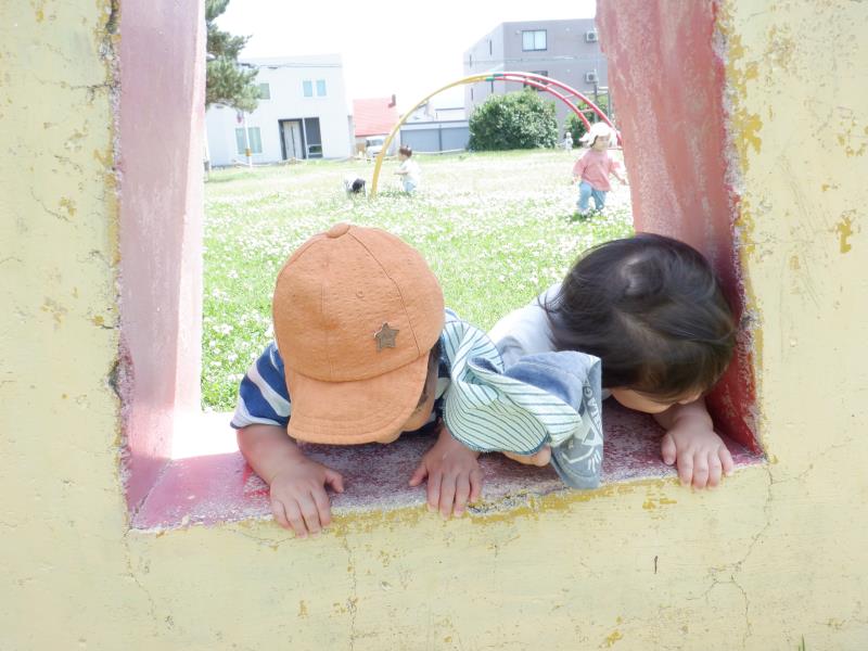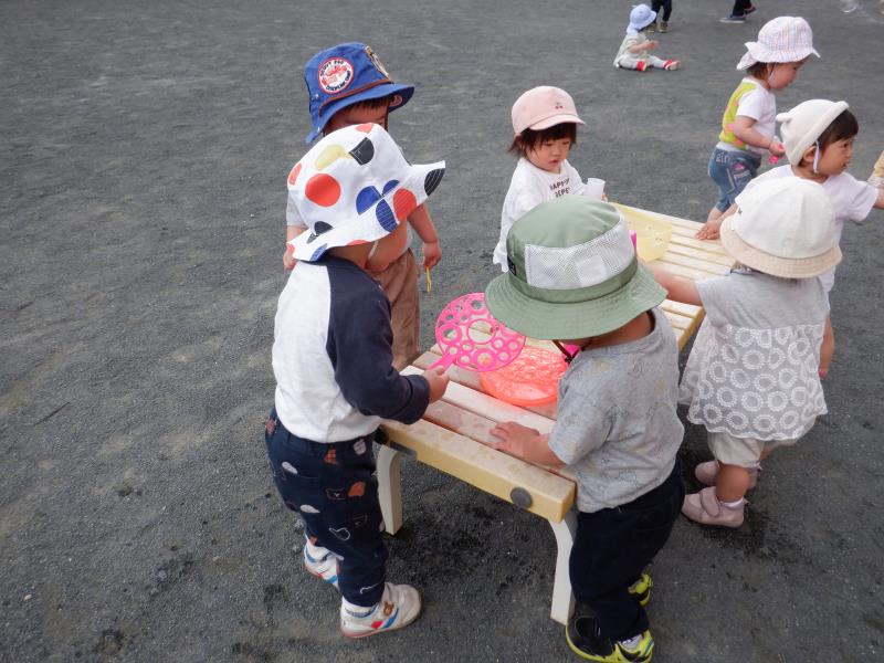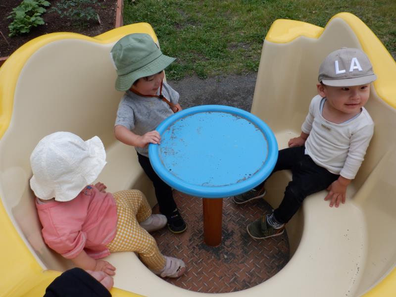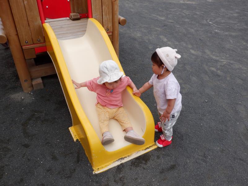 おもちゃやすべり台で遊んだり、お砂場や園庭でも少しだけ遊ぶことができました♬