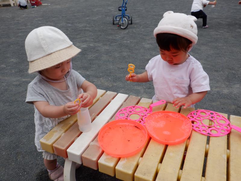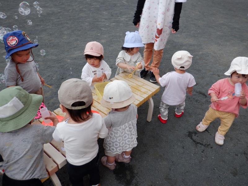 しゃぼん玉はみんな興味津々で、ふ~っと吹いたりしゃぼん玉に喜んでいましたよ!