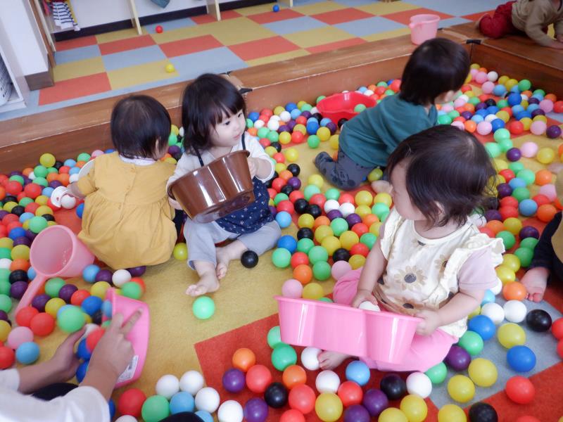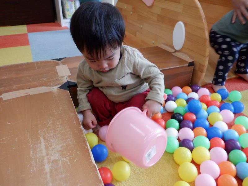お友達同士で桶の中にボールを入れあって、かかわり合いながら遊ぶ姿も可愛かったですよ♡