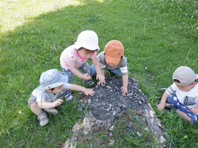 切り株の上に石を集めて遊んだり、自然にふれてたくさん遊ぶことができました☺