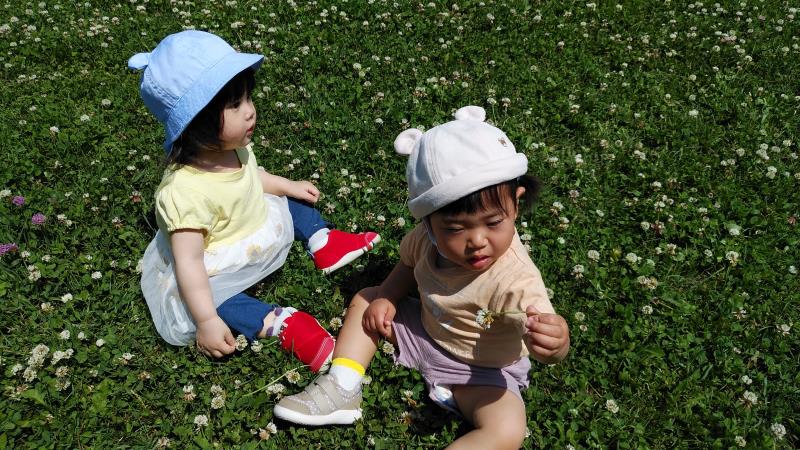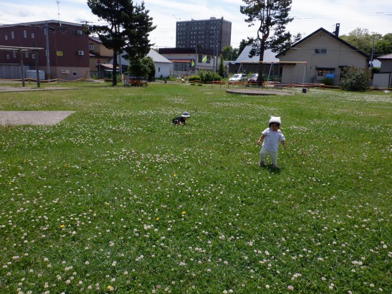 山下公園にお散歩へ行くと、前までタンポポがいっぱいだったのが一面シロツメクサに!