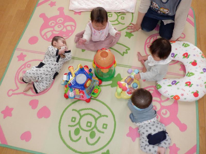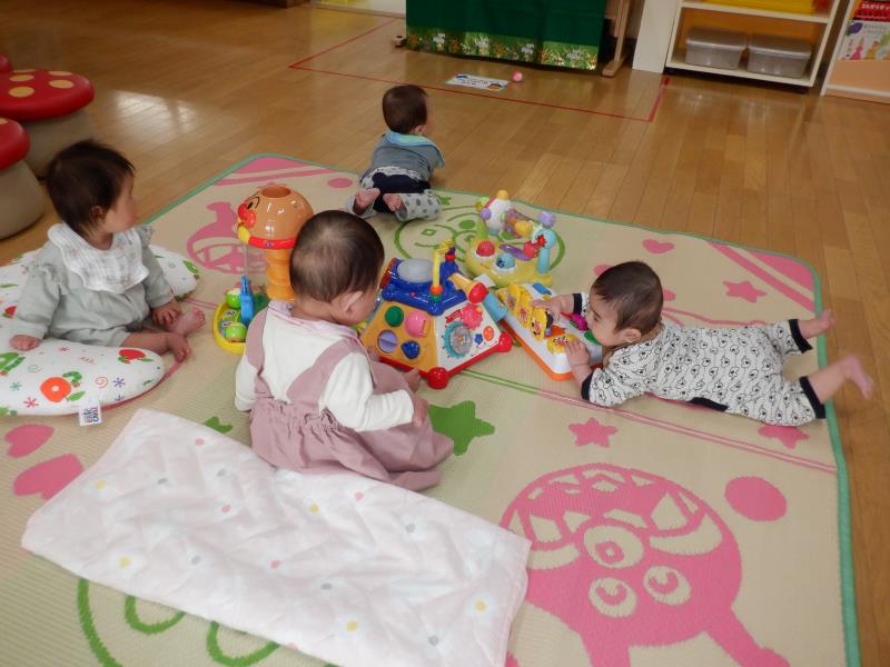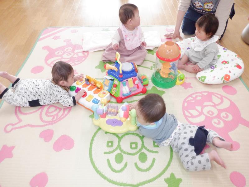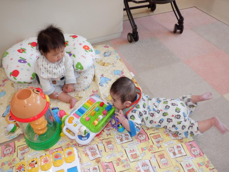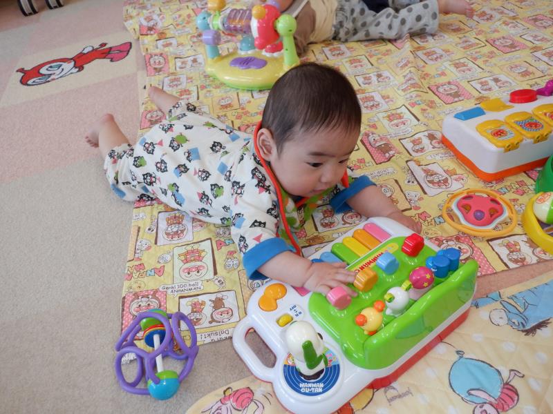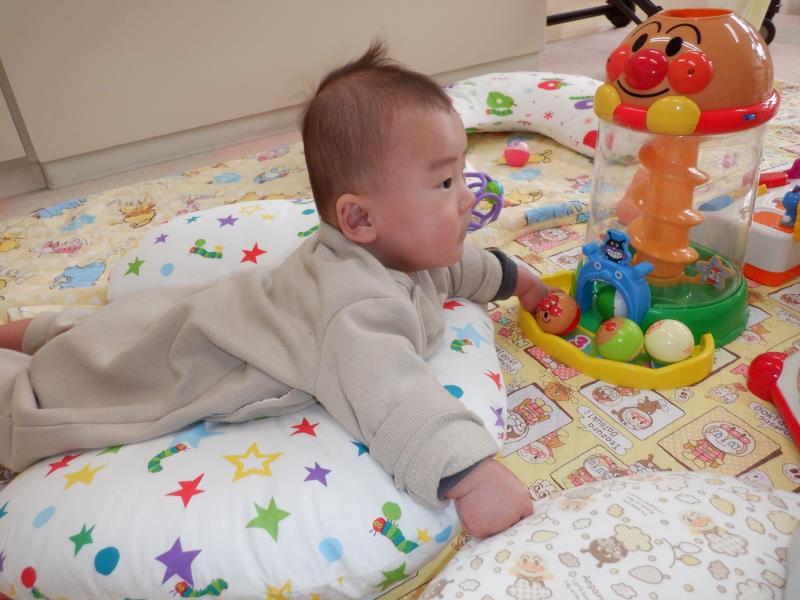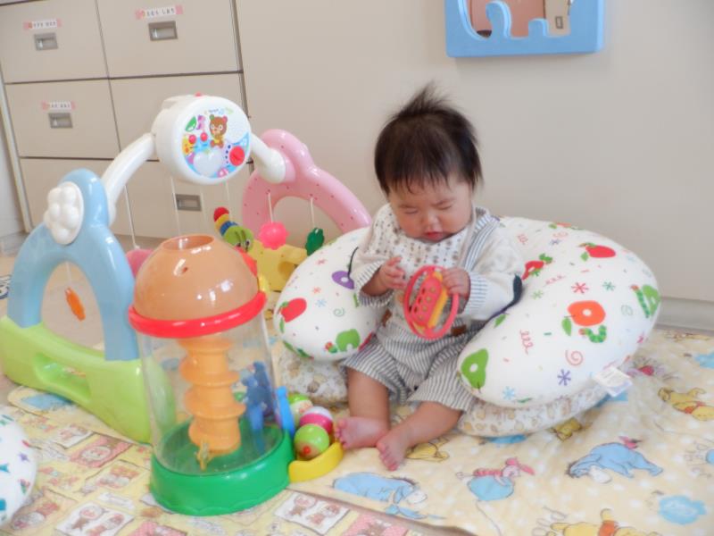 お座りや腹ばいでお気に入りのおもちゃに手を伸ばして、カミカミしたりフリフリしたりとご機嫌♪