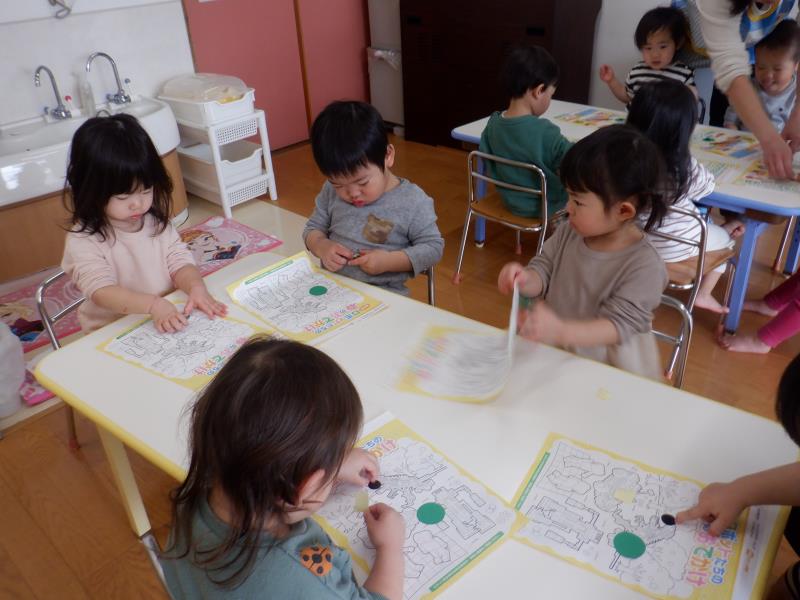 丸シールをペタッと貼って、こいのぼりの目ができた♪