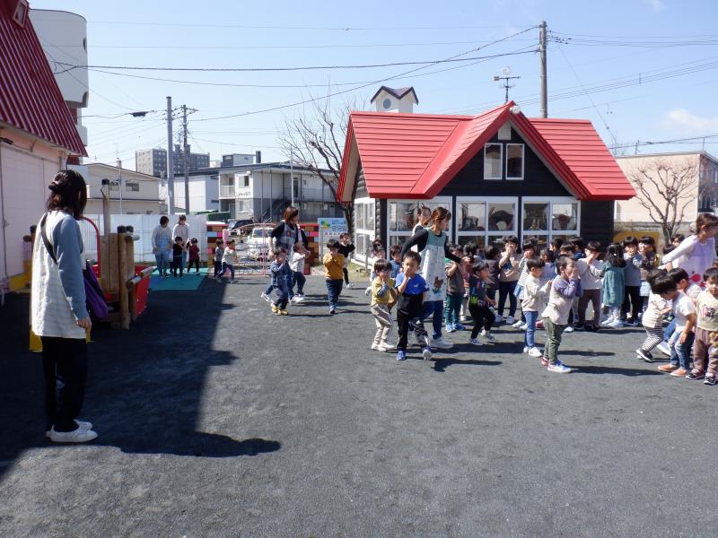 小さいお友達は、非常ベルの音にびっくりして涙することもありましたが、全員園庭へ逃げることができました。