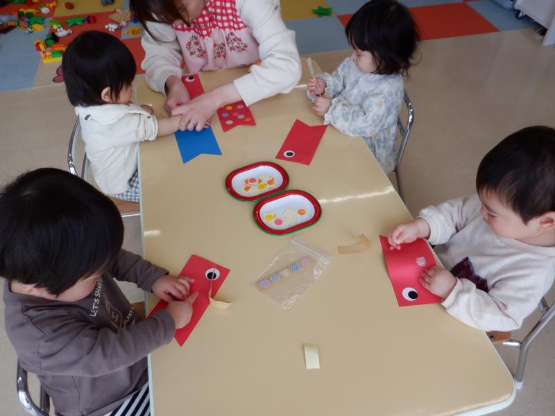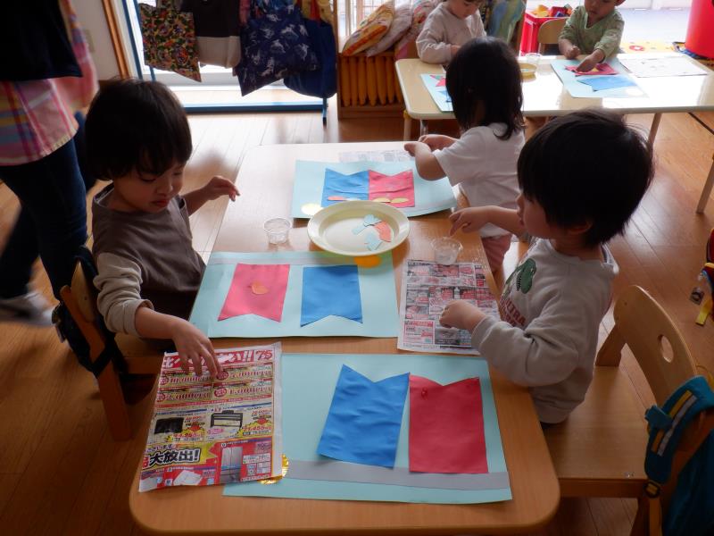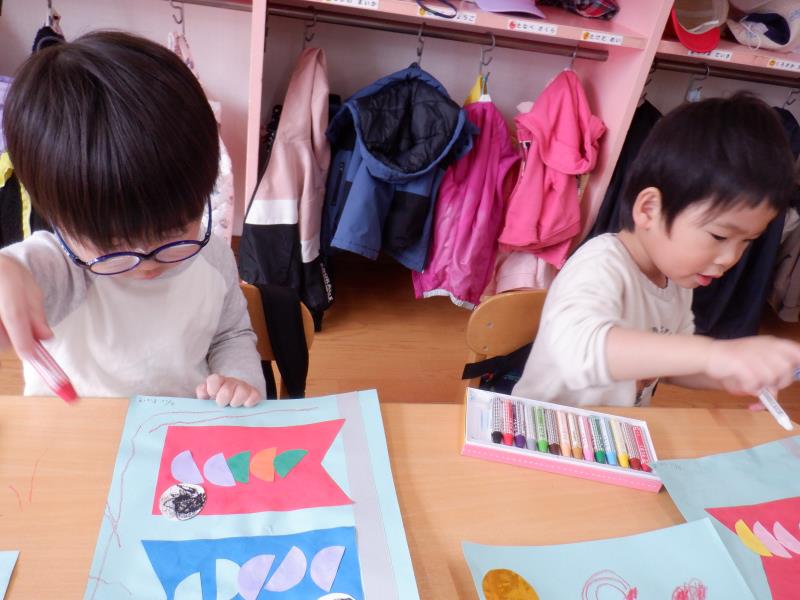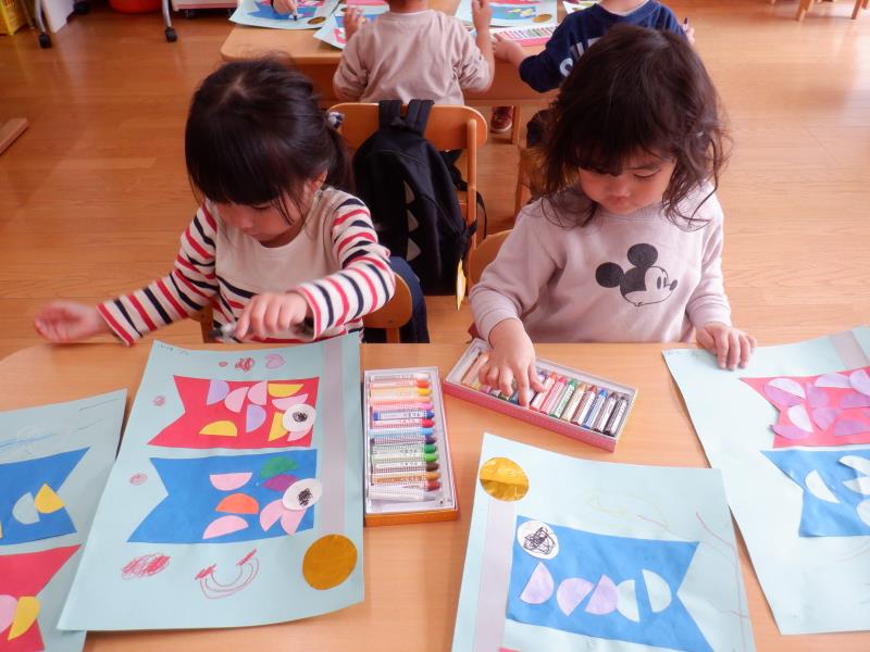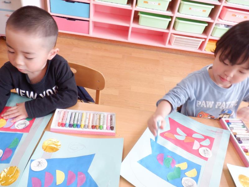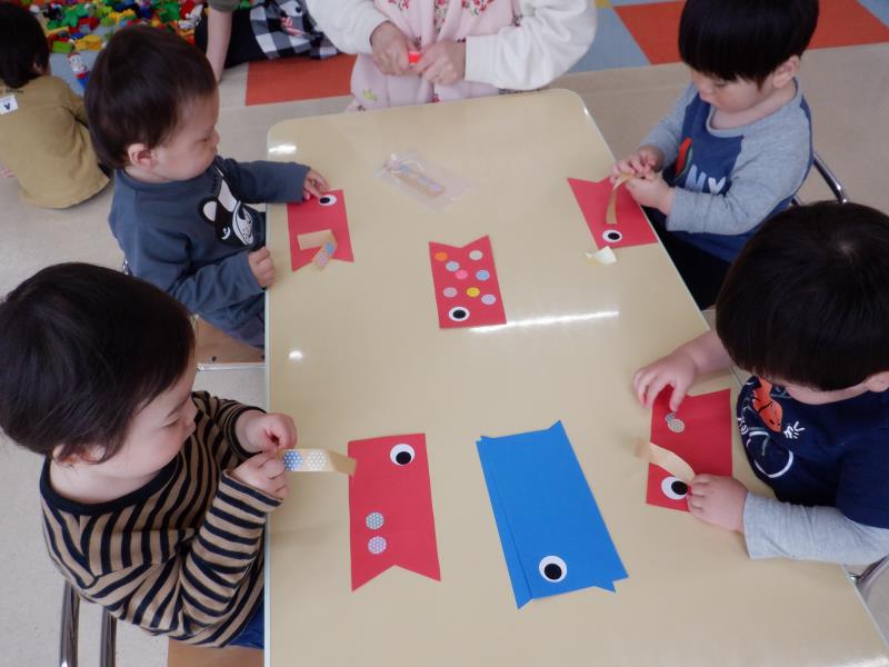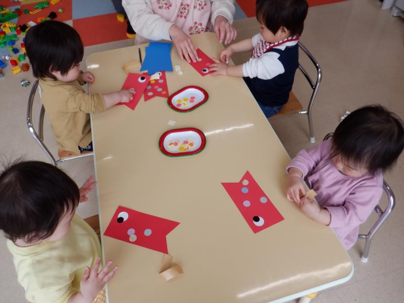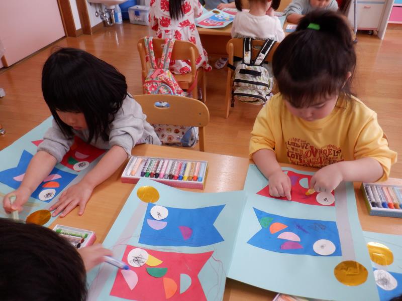 お父さんこいのぼりとお母さんこいのぼりを台紙にペッタンした後は、うろこも付けちゃうよ!