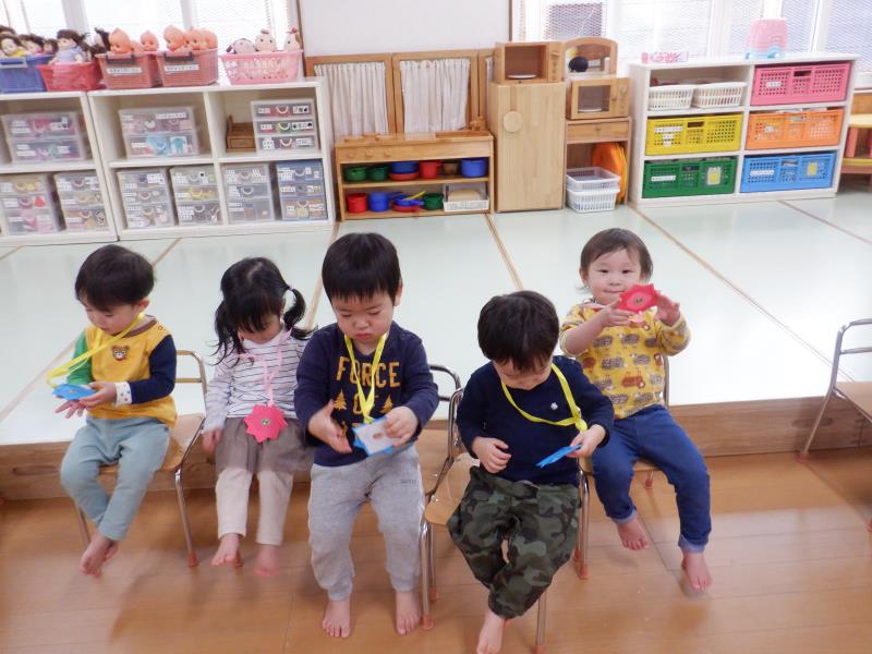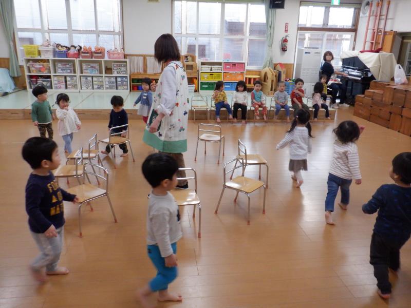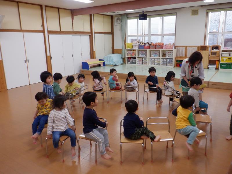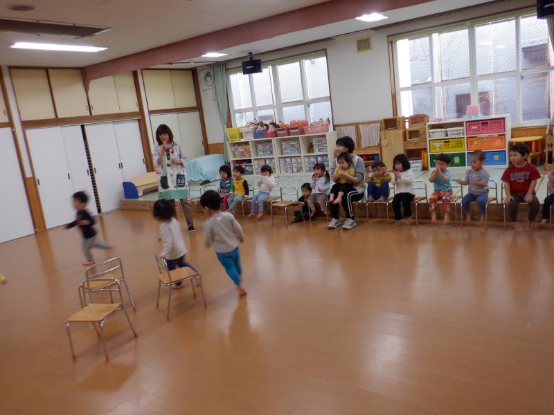 お遊戯室でイス取りゲームをして、進級お楽しみ会をしたたんぽぽさん!