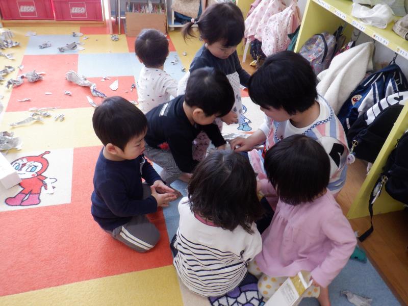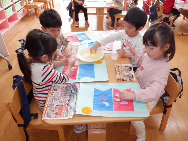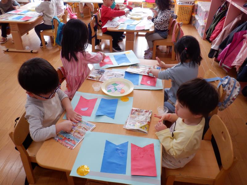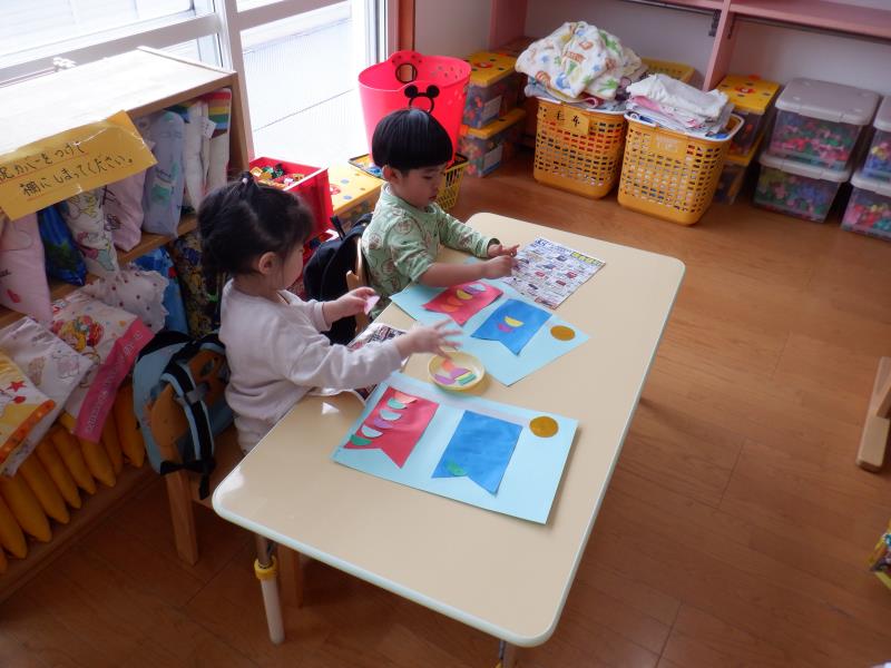 いろんな色があって、どんな風に付けようか考えながらみんな上手にペタペタ。完成が楽しみだね~!