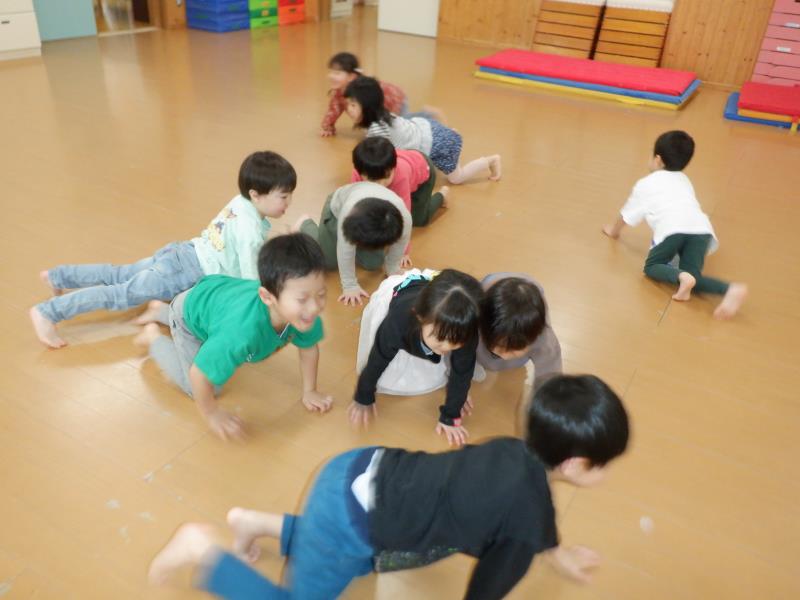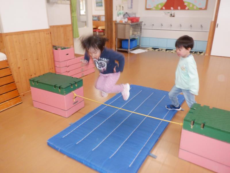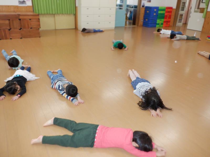 お遊戯室でリズム運動をしたあとは、いろいろな運動あそびに挑戦!