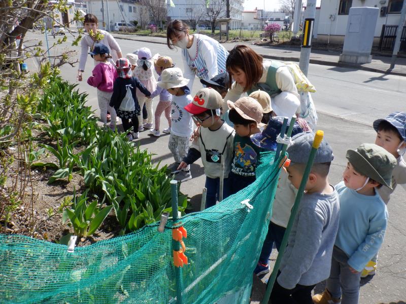 いつも通る道で見ていたチューリップの葉から、蕾が出ているのを発見!咲くのが楽しみ♪