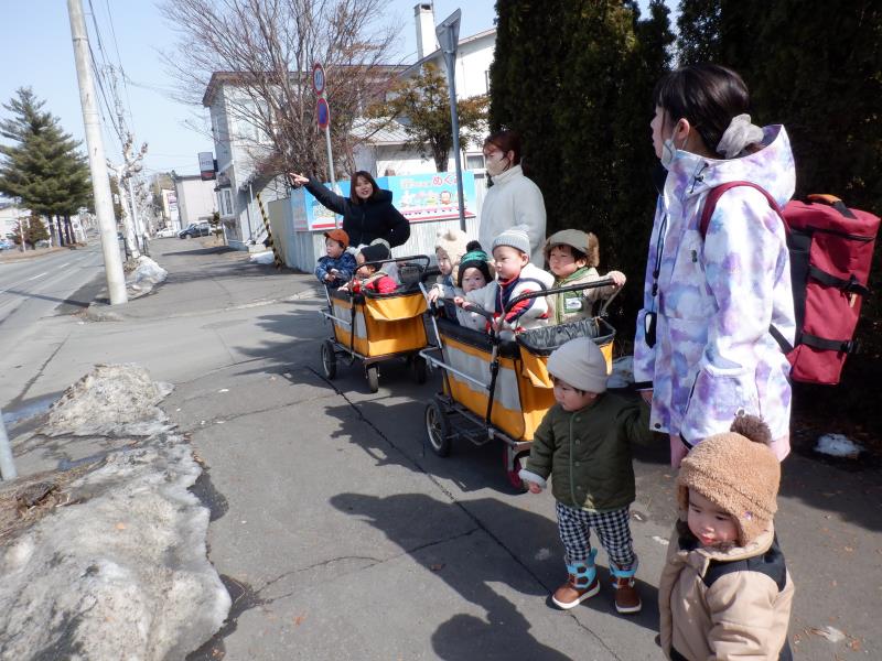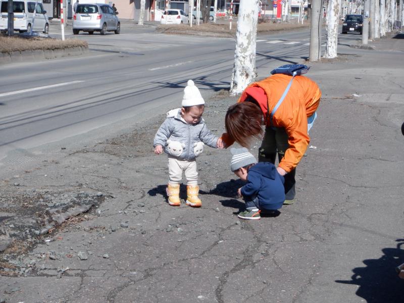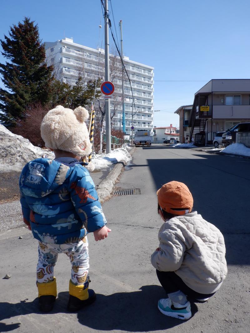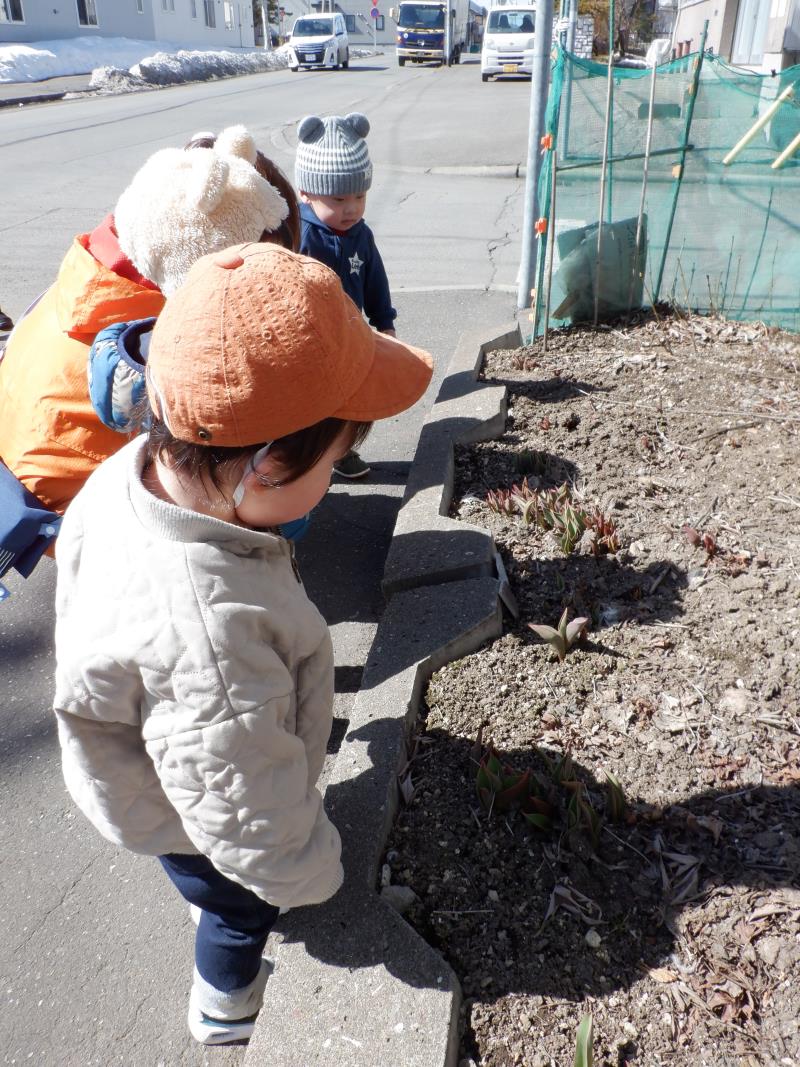 帰り道、クレーン車発見!ちゅうりっぷのつぼみも発見!