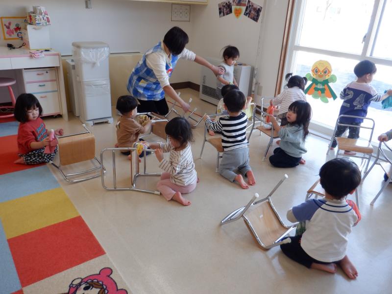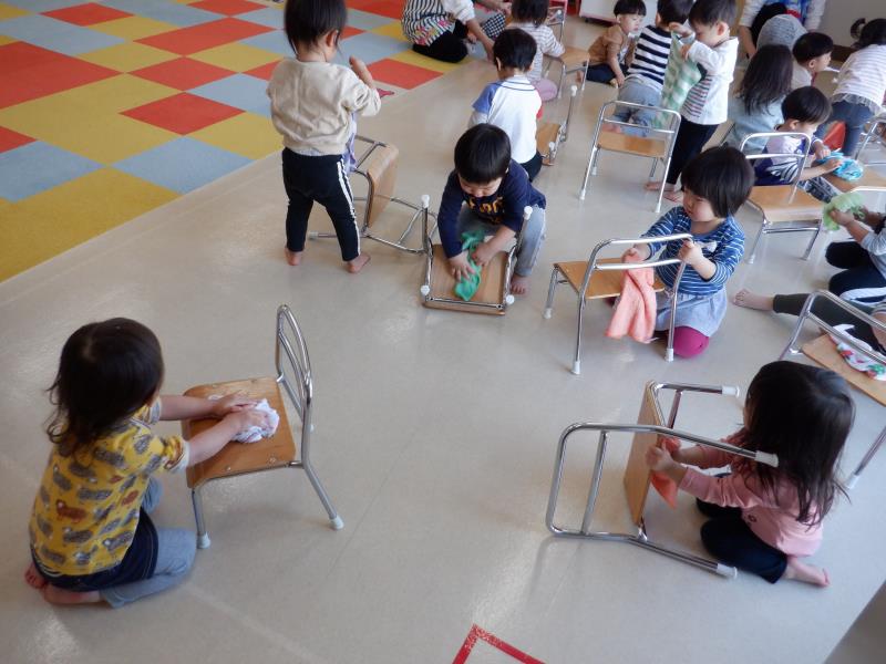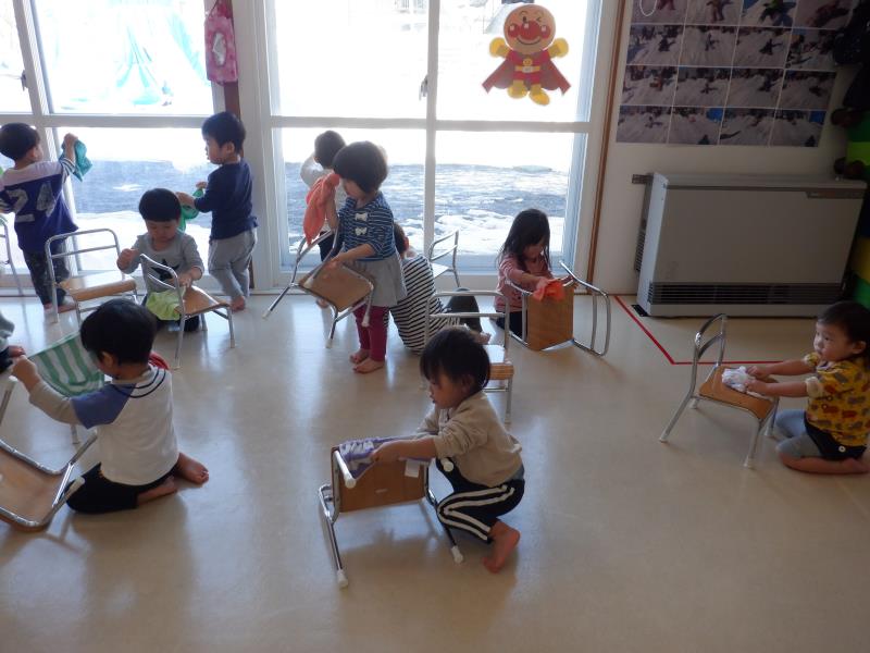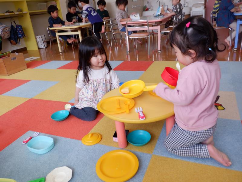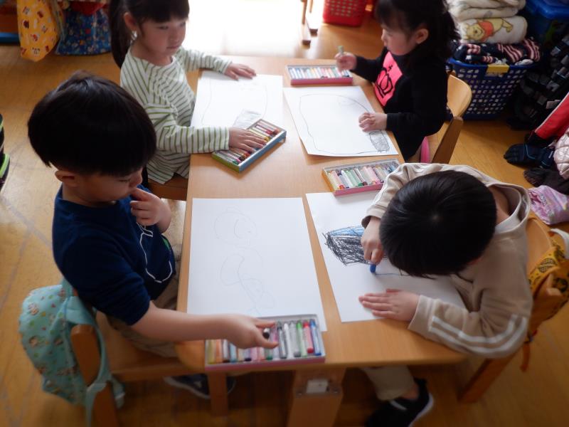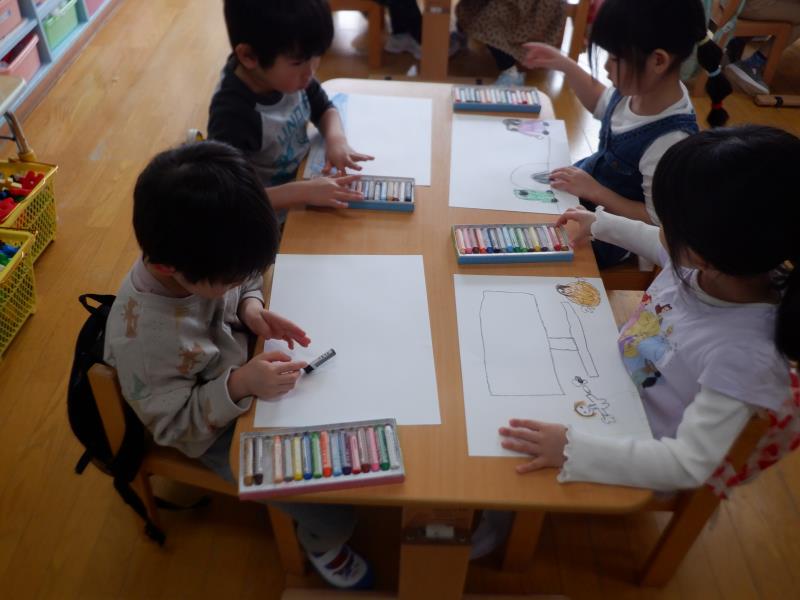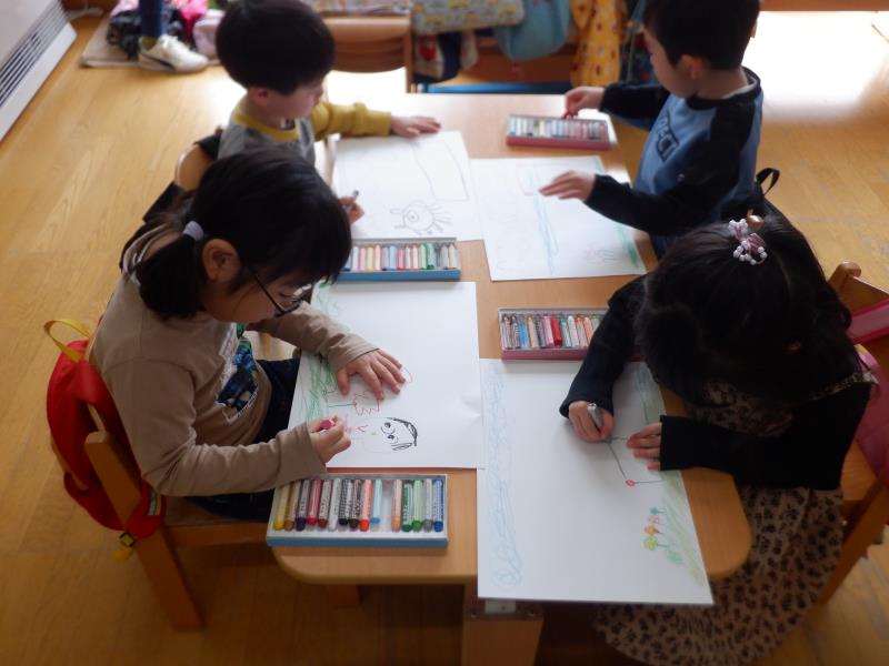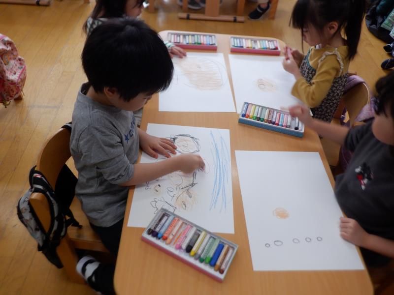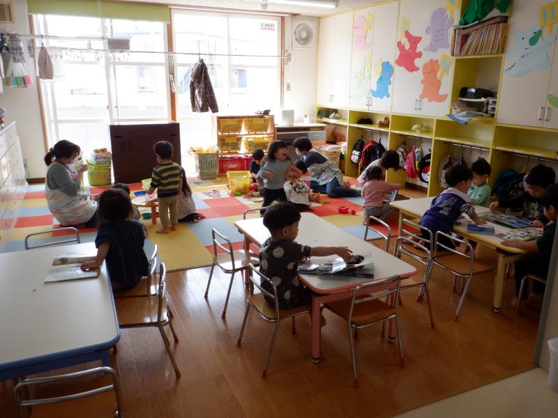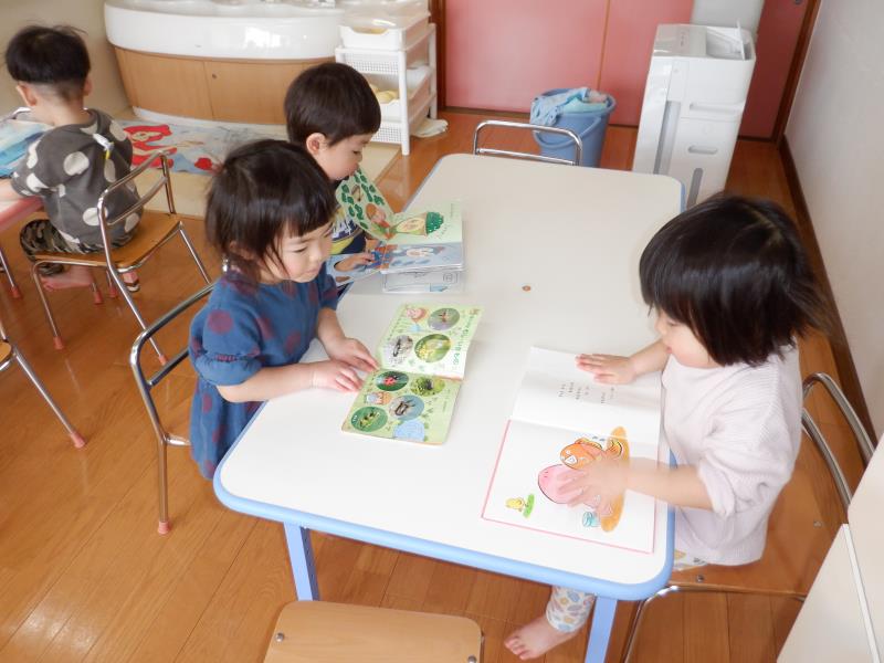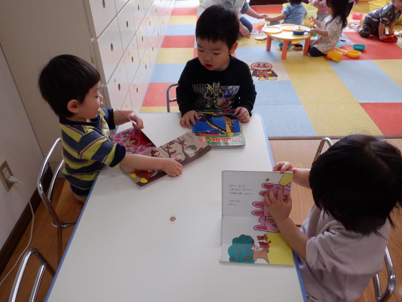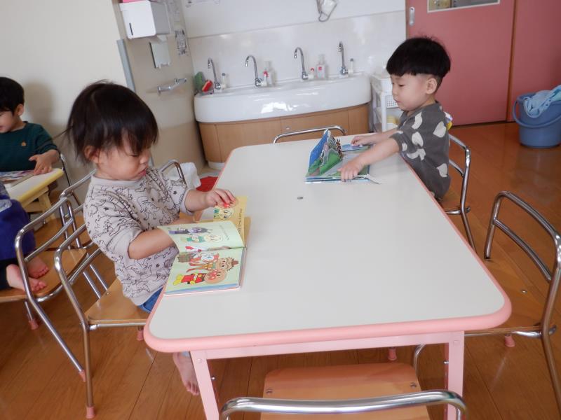 今回は、椅子に座って、テーブルで絵本をみたよ。