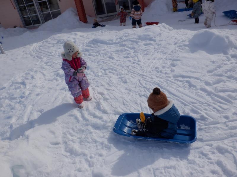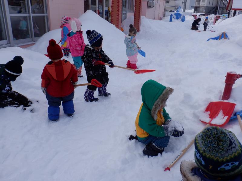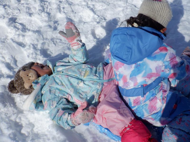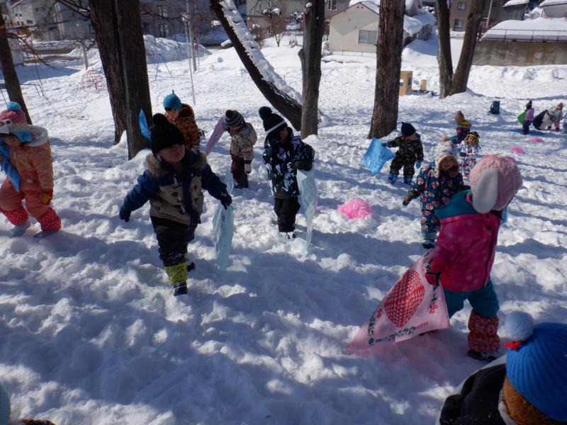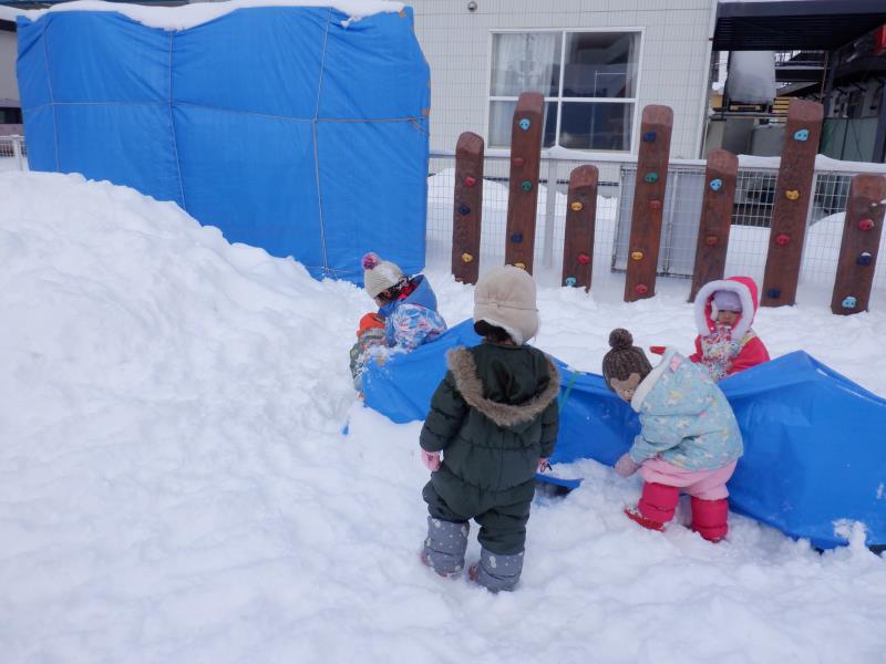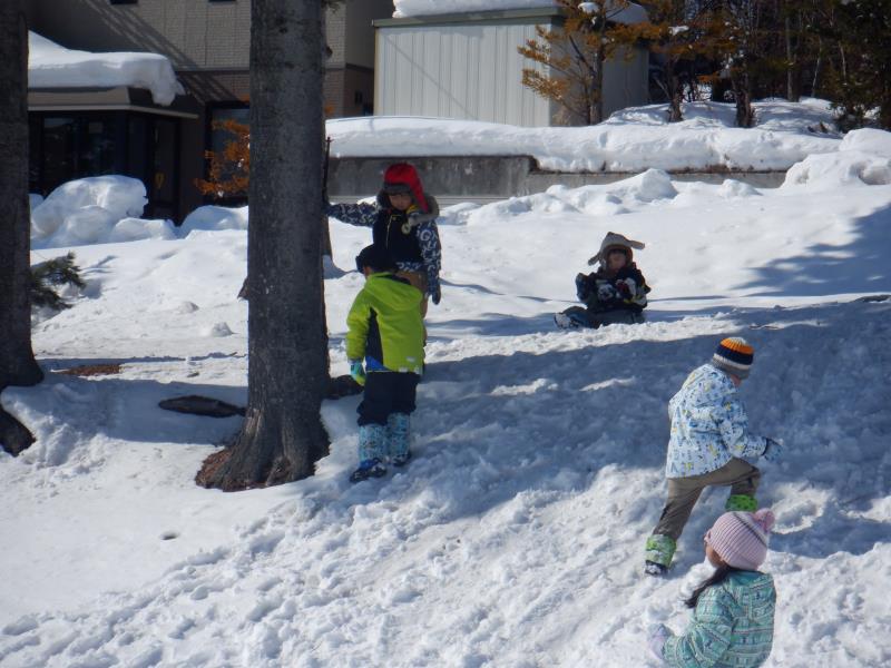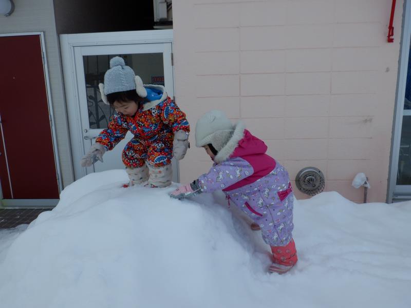 昨日雪が降って、さっそく園庭に出てみたよ。