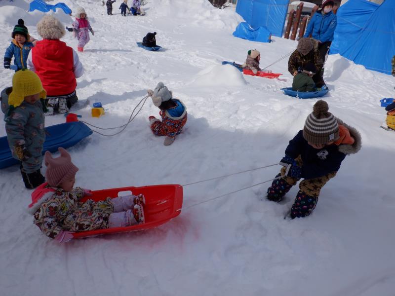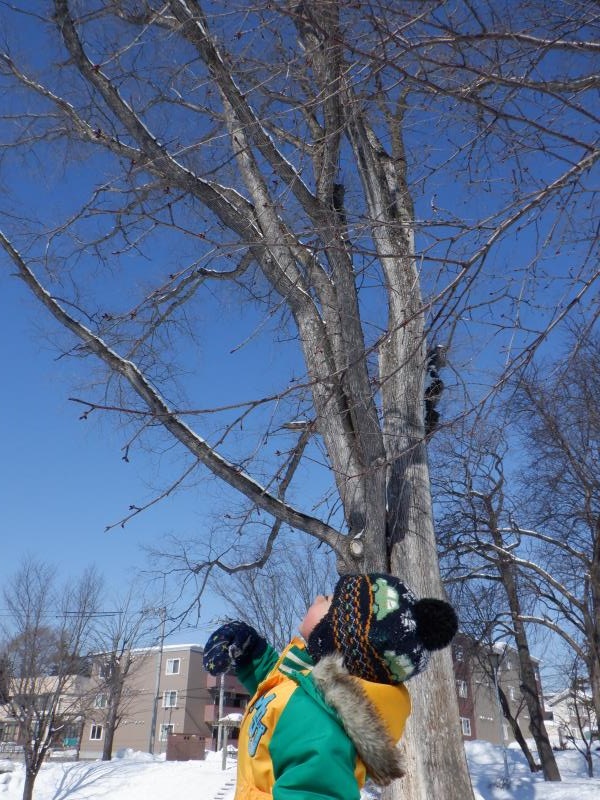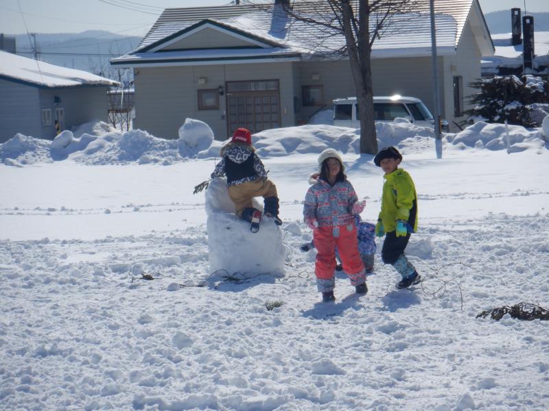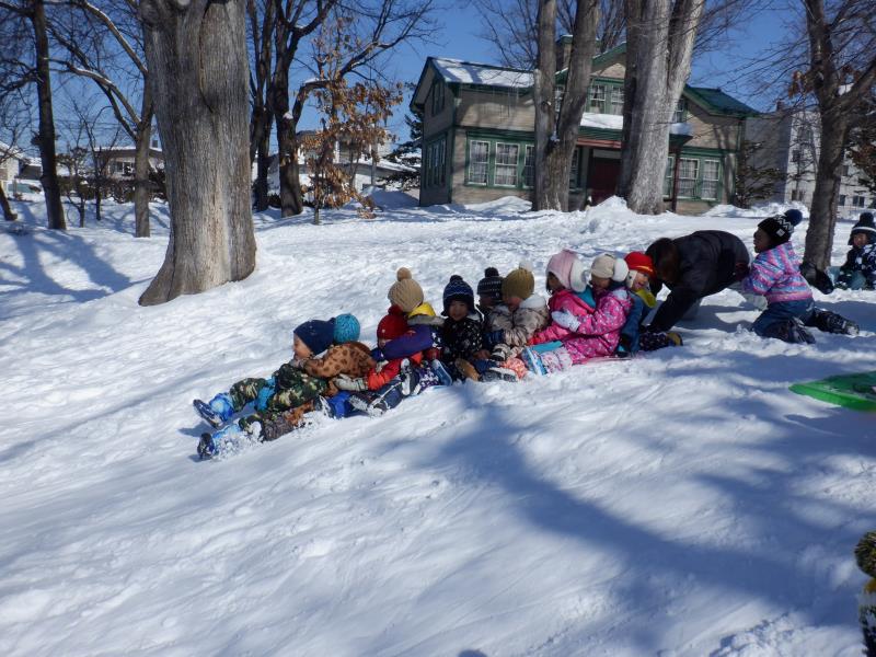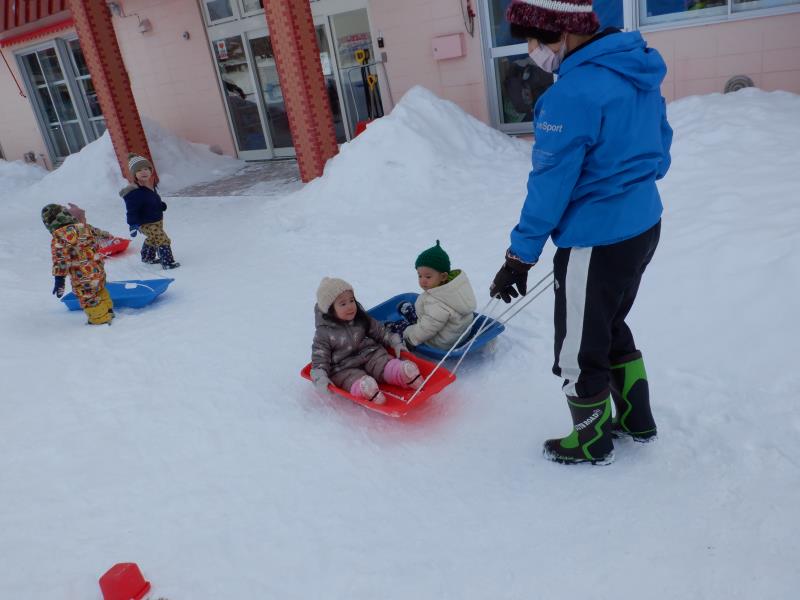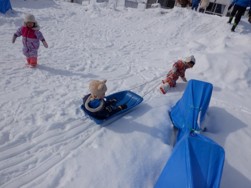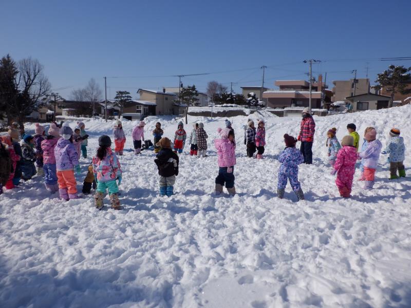 昨日雪が降って、さっそく園庭に出てみたよ。