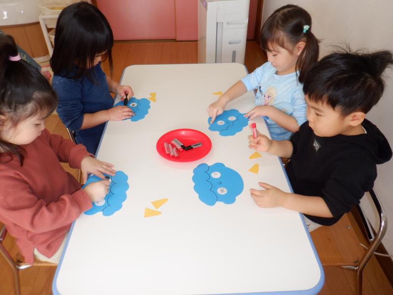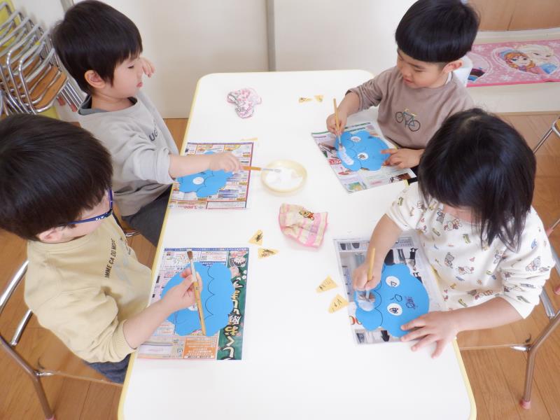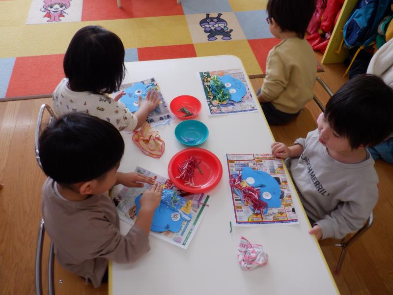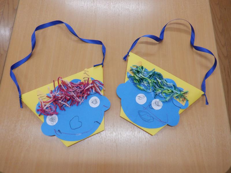髪の毛は、好きな色の毛糸をボンドで付けた!