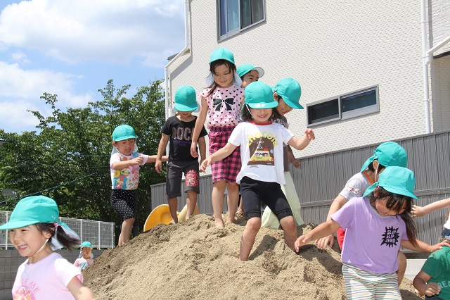| はじめてのどろんこ保育の年少組さんでしたが、 大きな泥山を見ると「うわー!!」と気持ちも高まっていました。 裸足の感触。 砂と水が混ざった感触。 五感を存分に使って、思いっきり楽しんでいました。 「先生楽しい!!」と思わず口にだしてしまうほど、夢中になって遊びました。 次回のどろんこ保育が待ちきれないですね♪ 主任 大西 |