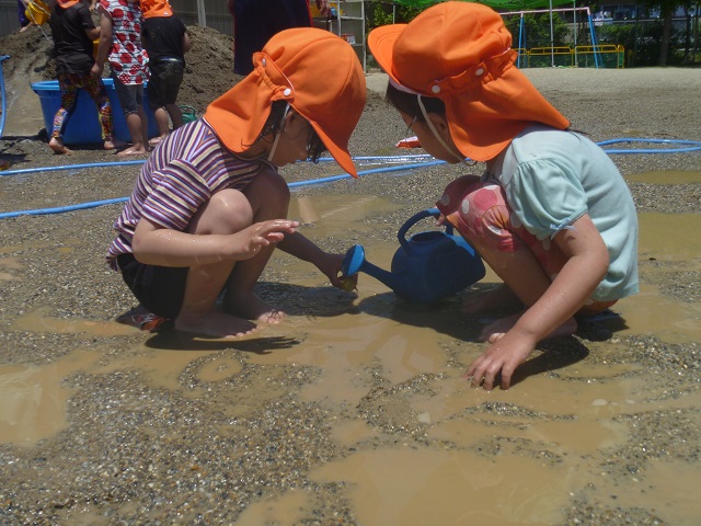 | 初めは、泥に触れることから始まり、遊びこんでいくと、動きもだんだんと大胆になっていきます!! 「ずーっと遊んでたいよー!!」 いい天気でとっても気持ちよかったね♪ |